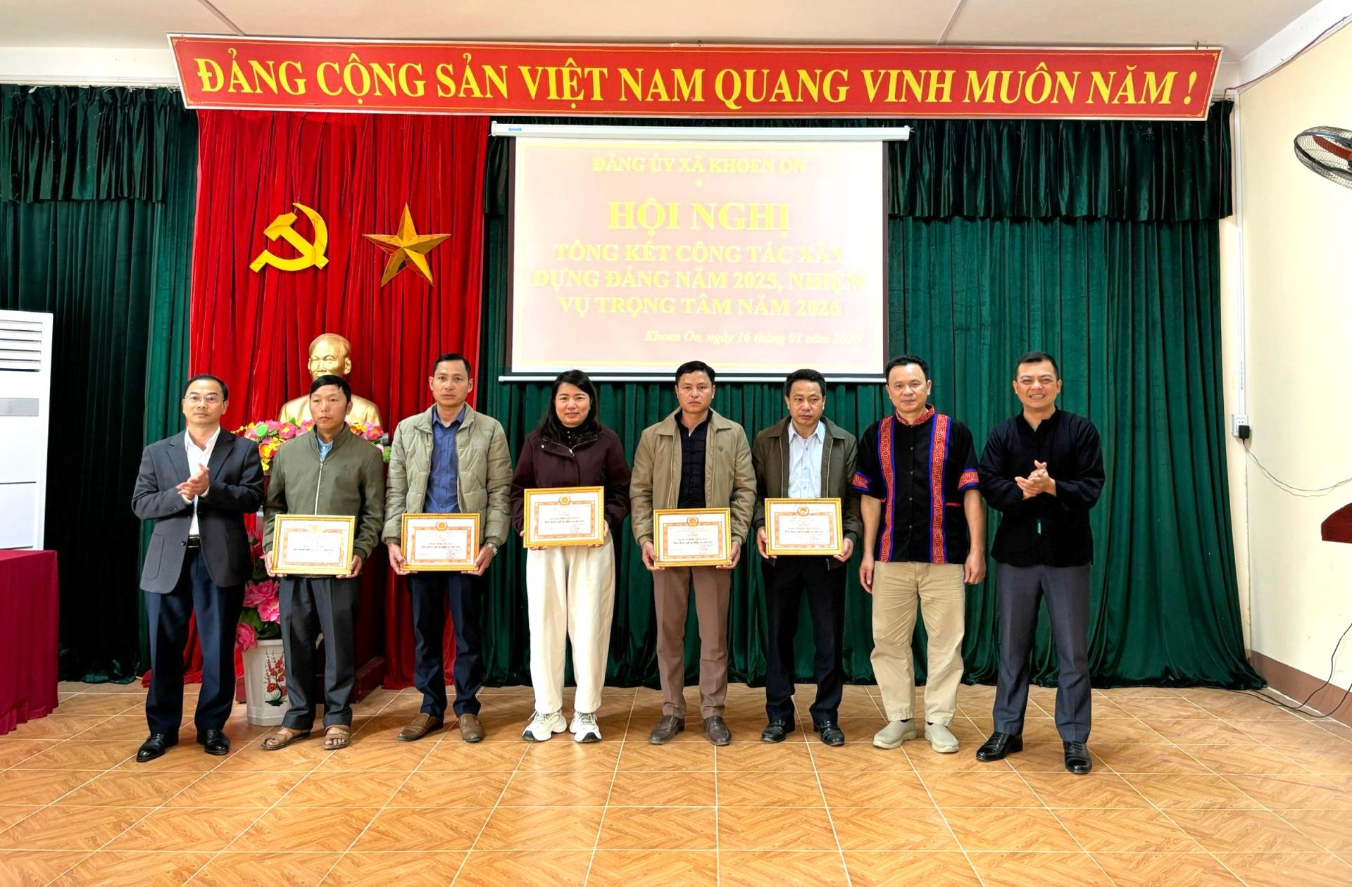 Các đồng chí Thường trực Đảng ủy xã Khoen On trao giấy khen cho các tập thể xuất sắc trong năm 2025.