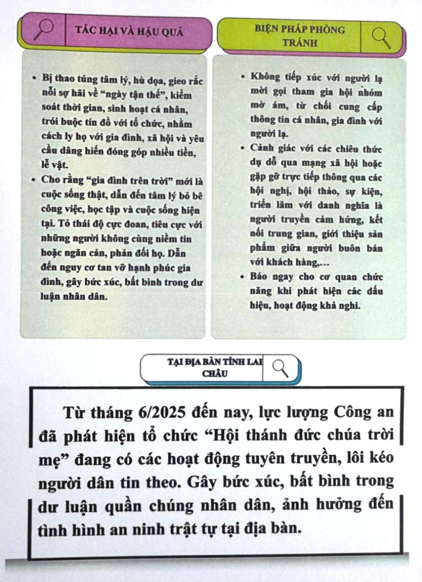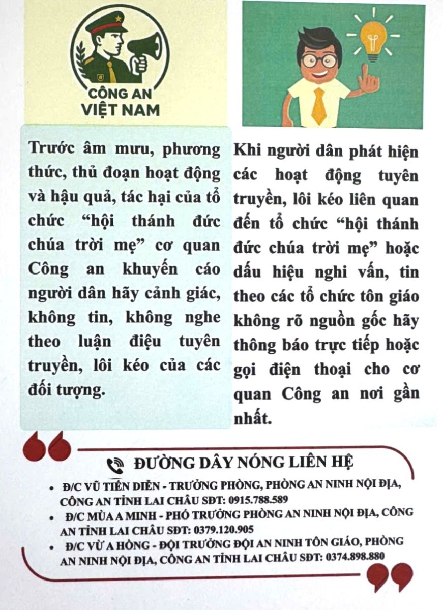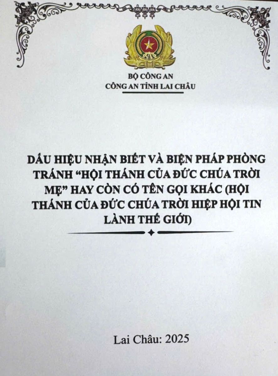 Cổng Thông tin điện tử tỉnh Lai Châu trân trọng giới thiệu tài liệu do Công an tỉnh cung cấp: Dấu hiệu nhận biết và biện pháp phòng tránh "Hội thánh của Đức Chúa Trời Mẹ" hay còn có tên gọi khác (Hội thánh của Đức Chúa Trời Hiệp hội Tin lành thế ...