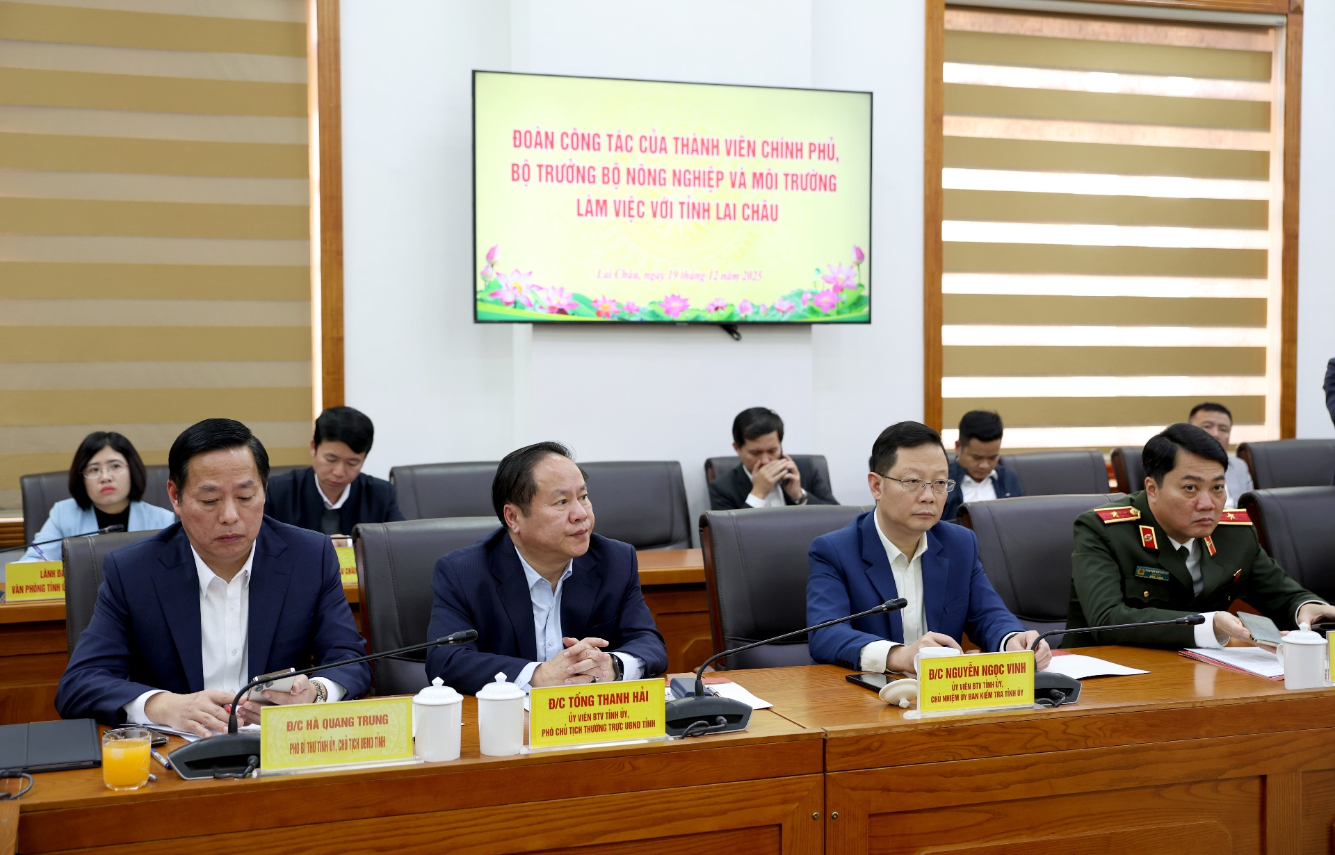 Phát biểu kết luận buổi làm việc, đồng chí Trần Đức Thắng - Ủy viên Ban Chấp hành Trung ương Đảng, Bộ trưởng Bộ Nông nghiệp và Môi trường ghi nhận và đánh giá cao những kết quả tỉnh Lai Châu đạt được trong phát triển kinh tế - xã hội thời gian qua. Đồng chí nhấn mạnh, với đặc thù là tỉnh miền núi, biên giới, Lai Châu có những lợi thế riêng có, nhất là khí hậu, tiềm năng phát triển rừng và đường biên giới tiếp giáp với tỉnh Vân Nam (Trung Quốc) dài, Bộ trưởng mong rằng, tỉnh Lai Châu sẽ tiếp tục phát huy những lợi thế để thúc đẩy diện mạo của địa phương ngày càng phát triển. Bộ Nông nghiệp và Môi trường tiếp tục quan tâm, tạo điều kiện để tỉnh Lai Châu phát triển rừng bền vững, tạo sinh kế cho người dân; kết nối các đơn vị, doanh nghiệp lớn để ưu tiên đầu tư phát triển chăn nuôi, trồng trọt ở địa phương.