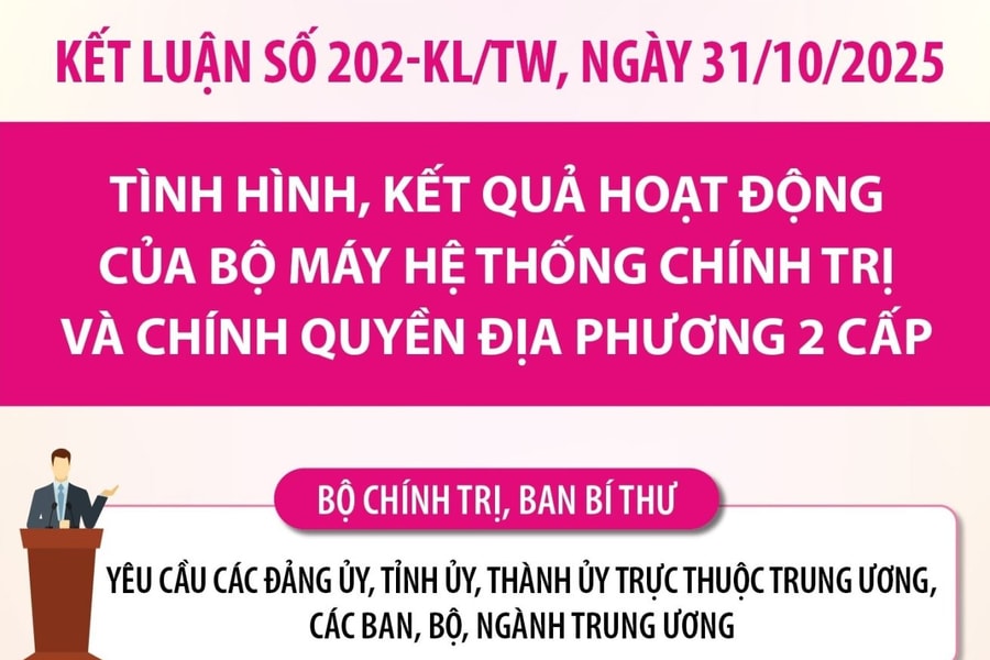 Tại Kết luận số 202-KL/TW ngày 31/10/2025 về tình hình, kết quả hoạt động của bộ máy hệ thống chính trị và chính quyền địa phương 2 cấp, Bộ Chính trị, Ban Bí thư yêu cầu các đảng ủy, tỉnh ủy, thành ủy trực thuộc Trung ương, các ban, bộ, ngành Trung ương chủ động, khẩn trương triển khai, hoàn thành các nhiệm vụ thuộc thẩm quyền và được giao tại các kết luận của Bộ Chính trị, Ban Bí thư, nhất là Kết luận số 195-KL/TW, ngày 26/9/2025 về bộ máy hệ thống chính trị và chính quyền địa phương 2 cấp.