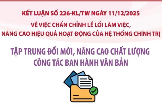 Về công tác ban hành văn bản, Kết luận số 226-KL/TW nêu rõ: Tập trung đổi mới, nâng cao chất lượng công tác ban hành văn bản theo hướng đơn giản hoá và rút gọn, tích hợp các quy trình, thủ tục trong ban hành văn bản. Không ban hành văn bản thuộc thẩm quyền riêng thay cho văn bản thuộc thẩm quyền chung của tổ chức, cơ quan, địa phương, đơn vị. Không đưa nội dung về công tác cán bộ, chế độ, chính sách vào văn bản quy định về chuyên môn, nghiệp vụ. Bảo đảm các văn bản được ban hành đúng thẩm quyền, đúng thể thức, kỹ thuật trình bày.
