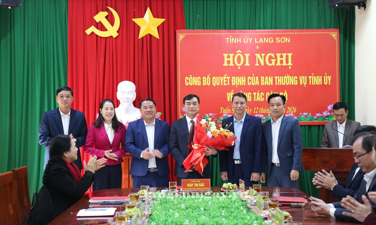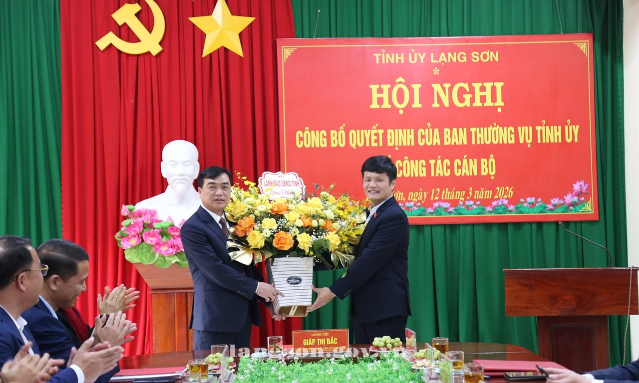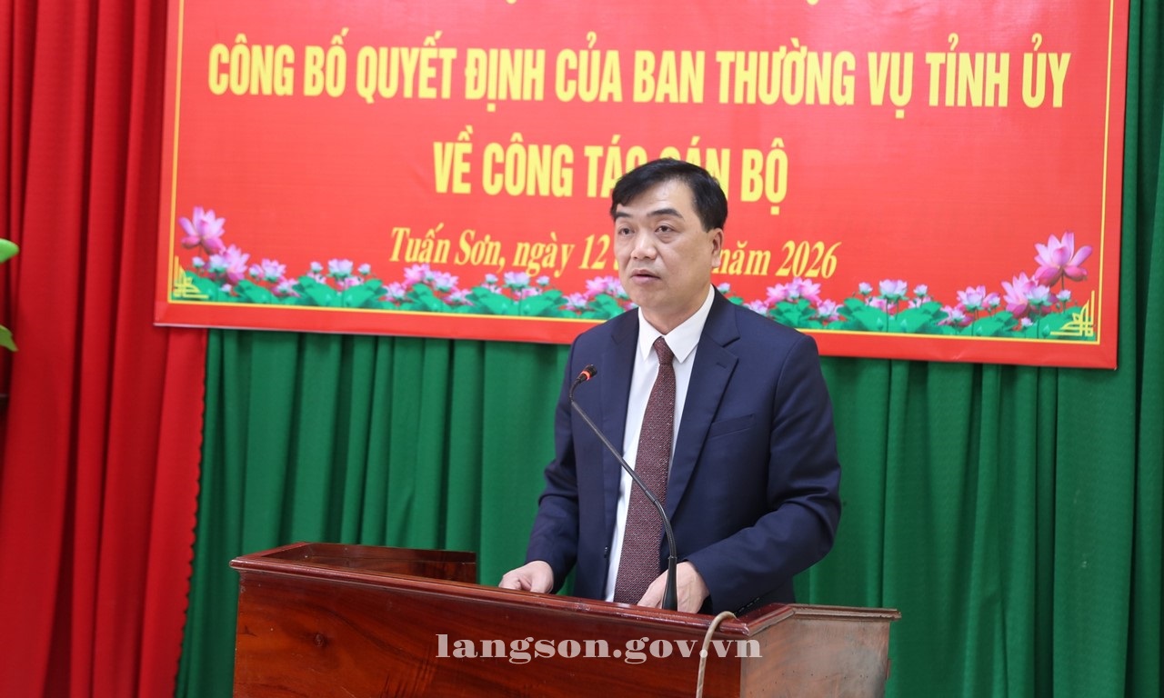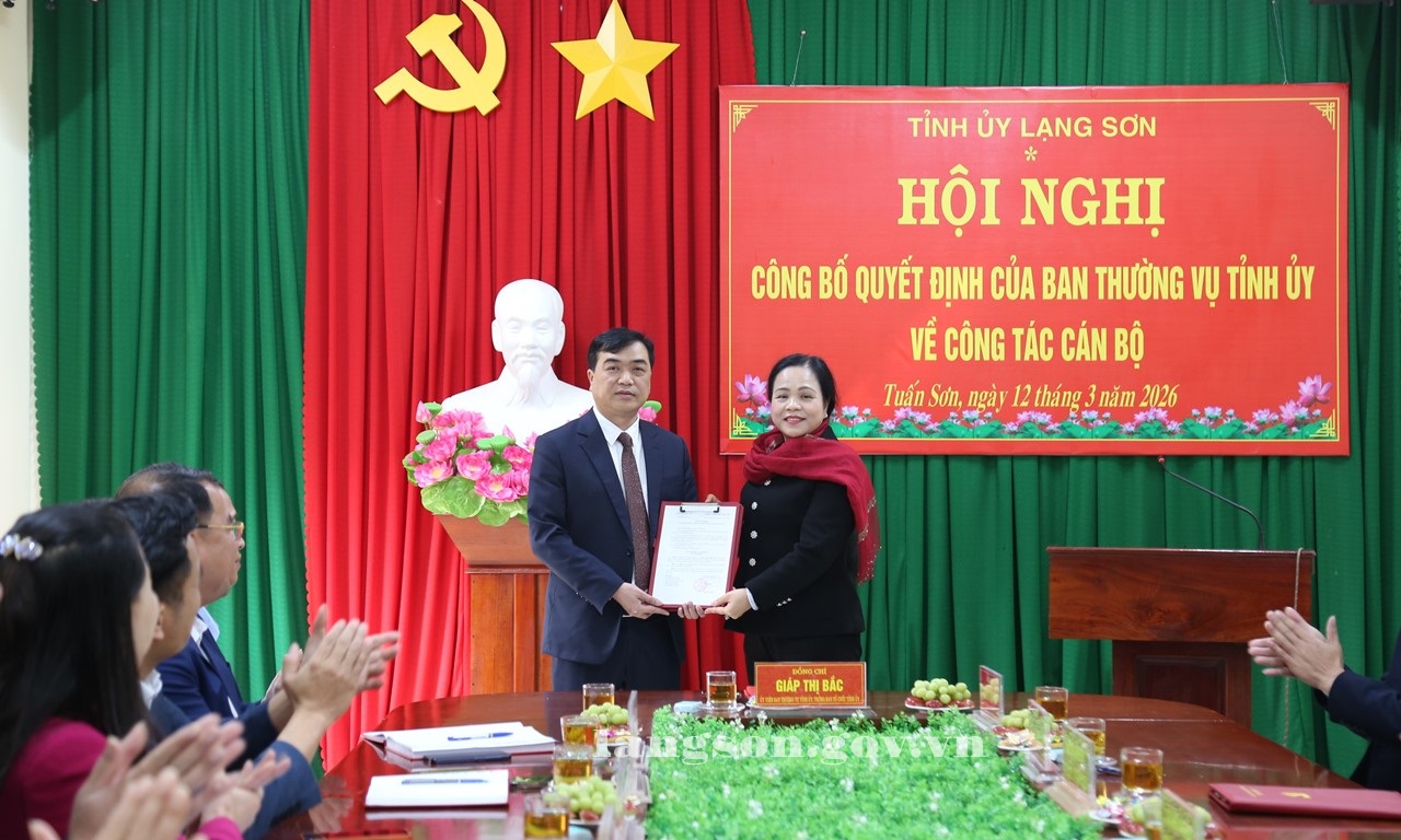 Ngày 12/3/2026, Tỉnh ủy Lạng Sơn tổ chức Hội nghị công bố Quyết định của Ban Thường vụ Tỉnh ủy về công tác cán bộ. Dự hội nghị có đồng chí Giáp Thị Bắc, Ủy viên Ban Thường vụ Tỉnh ủy, Trưởng Ban Tổ chức Tỉnh ủy; lãnh đạo Đảng ủy UBND tỉnh, lãnh đạo Văn phòng UBND tỉnh và các đồng chí Ủy viên Ban Thường vụ Đảng ủy xã Tuấn Sơn.
