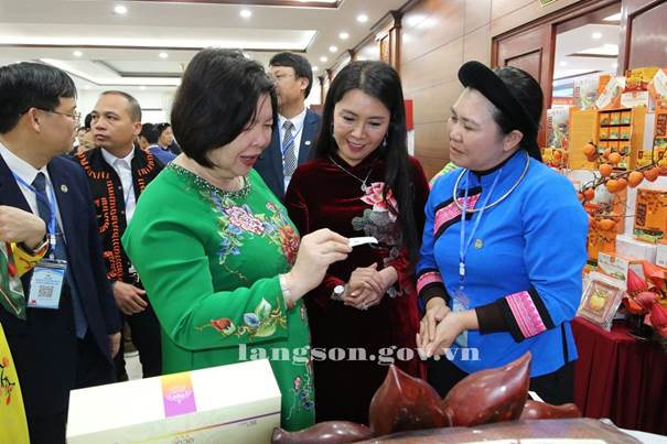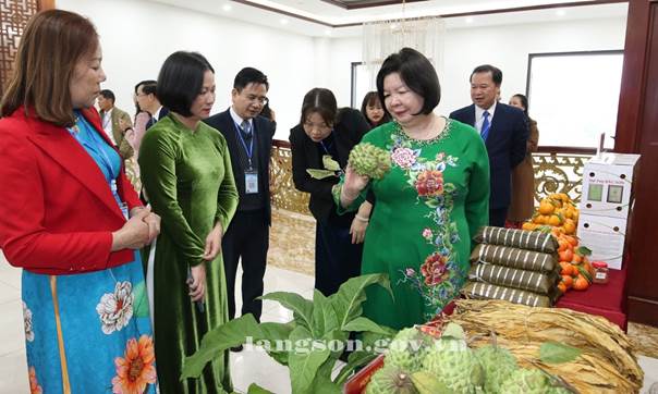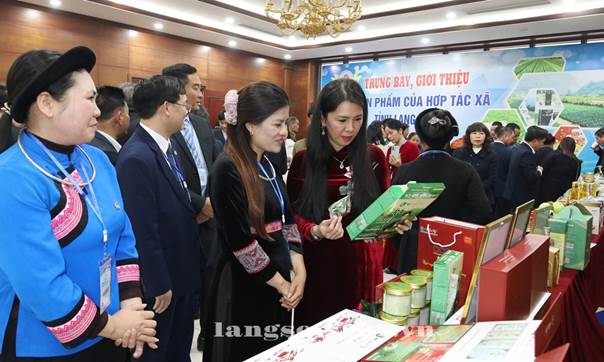 Đồng chí Đoàn Thu Hà, Phó Bí thư Tỉnh ủy, Chủ tịch Ủy ban MTTQ Việt Nam tỉnh và đồng chí Cao Xuân Thu Vân, Chủ tịch Liên minh HTX Việt Nam tham quan gian trưng bày, giới thiệu sản phẩm của các HTX trên địa bàn tỉnh