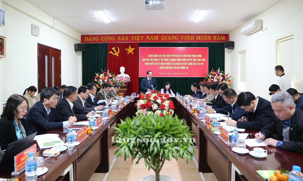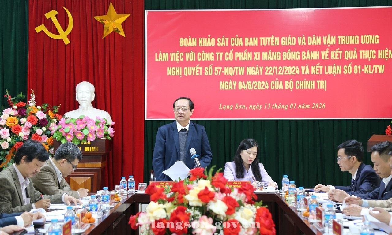 Phát biểu kết luận buổi làm việc, đồng chí Huỳnh Thành Đạt, Phó Trưởng Ban Tuyên giáo và Dân vận Trung ương ghi nhận, biểu dương những kết quả mà Công ty đã đạt được thời gian qua. Đồng chí khẳng định, Trung ương tiếp tục đồng hành cùng tỉnh Lạng Sơn trong việc tiếp tục triển khai các chủ trương lớn của Đảng và Nhà nước, đặc biệt là Nghị quyết số 57 và Kết luận số 81 của Bộ Chính trị.