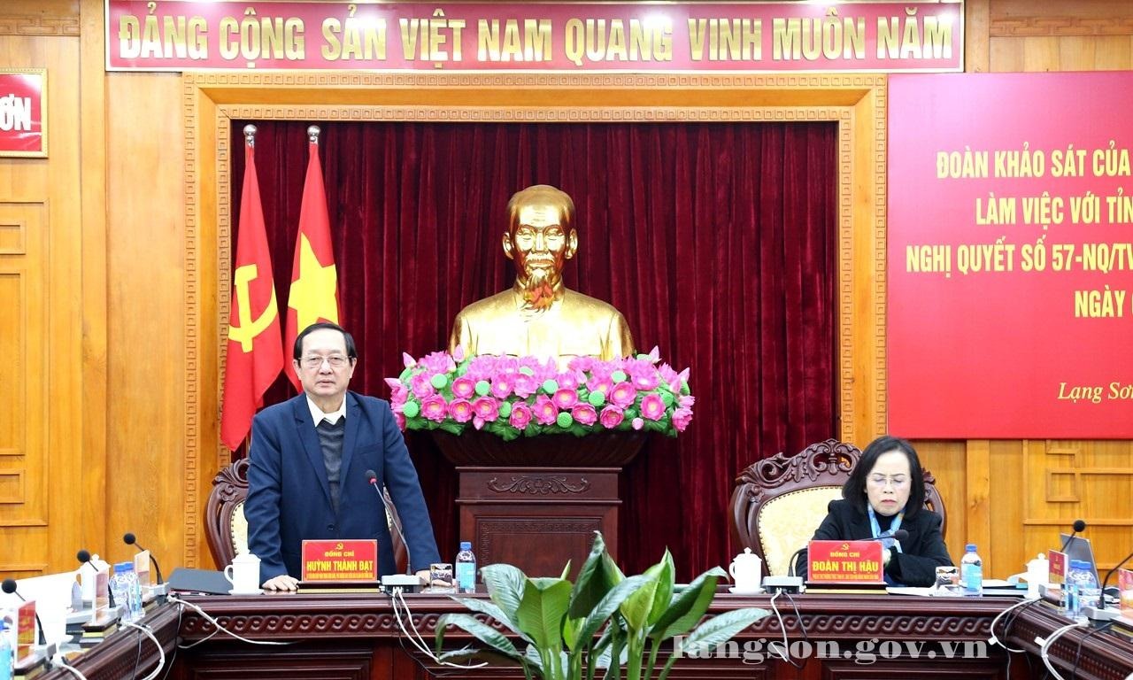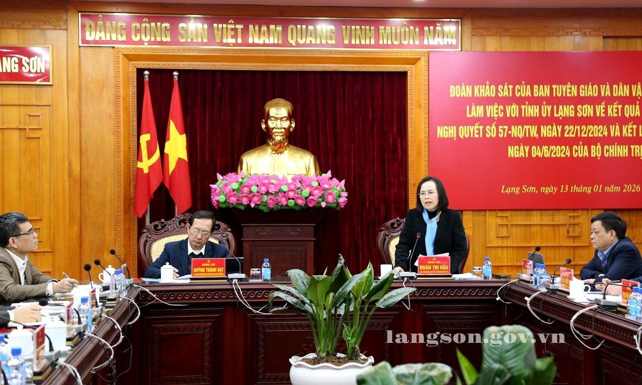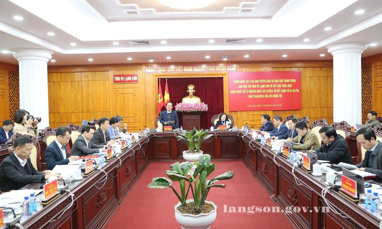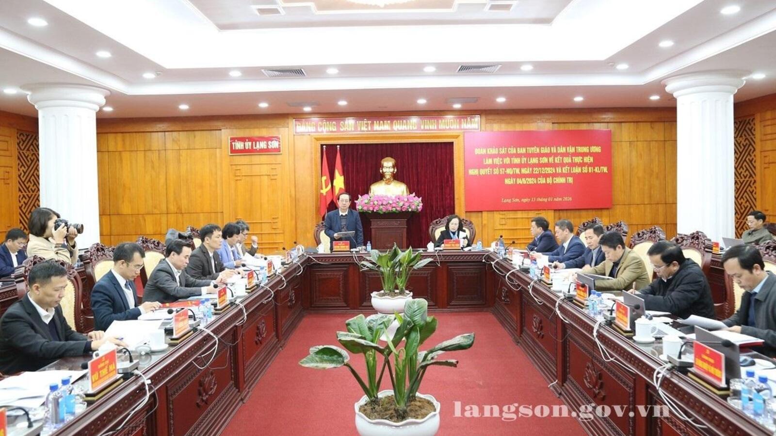 Ngày 13/01/2026, đoàn khảo sát của Ban Tuyên giáo và Dân vận Trung ương do đồng chí Huỳnh Thành Đạt, Ủy viên Trung ương Đảng, Phó Trưởng Ban Tuyên giáo và Dân vận Trung ương làm trưởng đoàn làm việc với Tỉnh ủy Lạng Sơn về kết quả thực hiện Nghị quyết số 57 ngày 22/12/2024 của Bộ Chính trị về đột phá phát triển khoa học, công nghệ, đổi mới sáng tạo và chuyển đổi số quốc gia và Kết luận số 81 ngày 4/6/2024 của Bộ Chính trị về tiếp tục thực hiện Nghị quyết số 24-NQ/TW về chủ động ứng phó với biến đổi khí hậu, tăng cường quản lý tài nguyên và bảo vệ môi trường. Tham gia đoàn khảo sát có lãnh đạo các vụ, đơn vị thuộc Ban Tuyên giáo và Dân vận Trung ương, Bộ Khoa học và Công nghệ, lãnh đạo các viện thuộc Viện Hàn lâm khoa học Việt Nam và một số đơn vị liên quan.