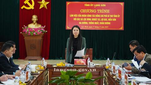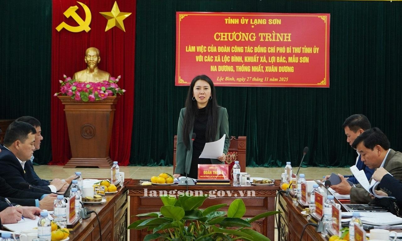Sáng 27/11/2025, đồng chí Đoàn Thu Hà, Phó Bí thư Tỉnh ủy, Chủ tịch Ủ ban MTTQ tỉnh, Tổ trưởng Tổ 4 (theo Quyết định số 58-QĐ/TU ngày 20/11/2025 của Ban Thường vụ Tỉnh ủy về việc phân công các đồng chí Ủy viên Ban Thường vụ Tỉnh ủy, Ủy viên Ban Chấp hành Đảng bộ tỉnh; cán bộ lãnh đạo các sở, ban ngành tỉnh phụ trách đảng bộ xã, phường) đã chủ trì Chương trình làm việc với Thường trực Đảng ủy các xã Mẫu Sơn, Lộc Bình, Na Dương, Lợi Bác, Thống Nhất, Xuân Dương, Khuất Xá để đánh giá công tác lãnh đạo, chỉ đạo, điều hành và kết quả triển khai thực hiện các nhiệm vụ từ ngày 01/7/2025 đến nay.