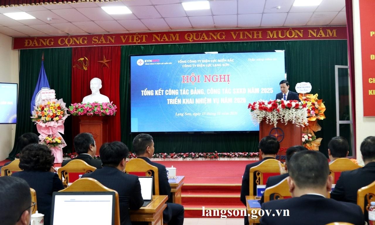 Chiều 15/01/2026, Công ty Điện lực Lạng Sơn tổ chức hội nghị tổng kết công tác đảng và công tác sản xuất, kinh doanh năm 2025; triển khai nhiệm vụ, kế hoạch năm 2026. Đồng chí Nguyễn Cảnh Toàn, Phó Bí thư Tỉnh ủy, Chủ tịch UBND tỉnh dự và chỉ đạo hội nghị. Tham dự hội nghị có lãnh đạo Tổng Công ty Điện lực Miền Bắc; lãnh đạo một số sở, ngành của tỉnh.