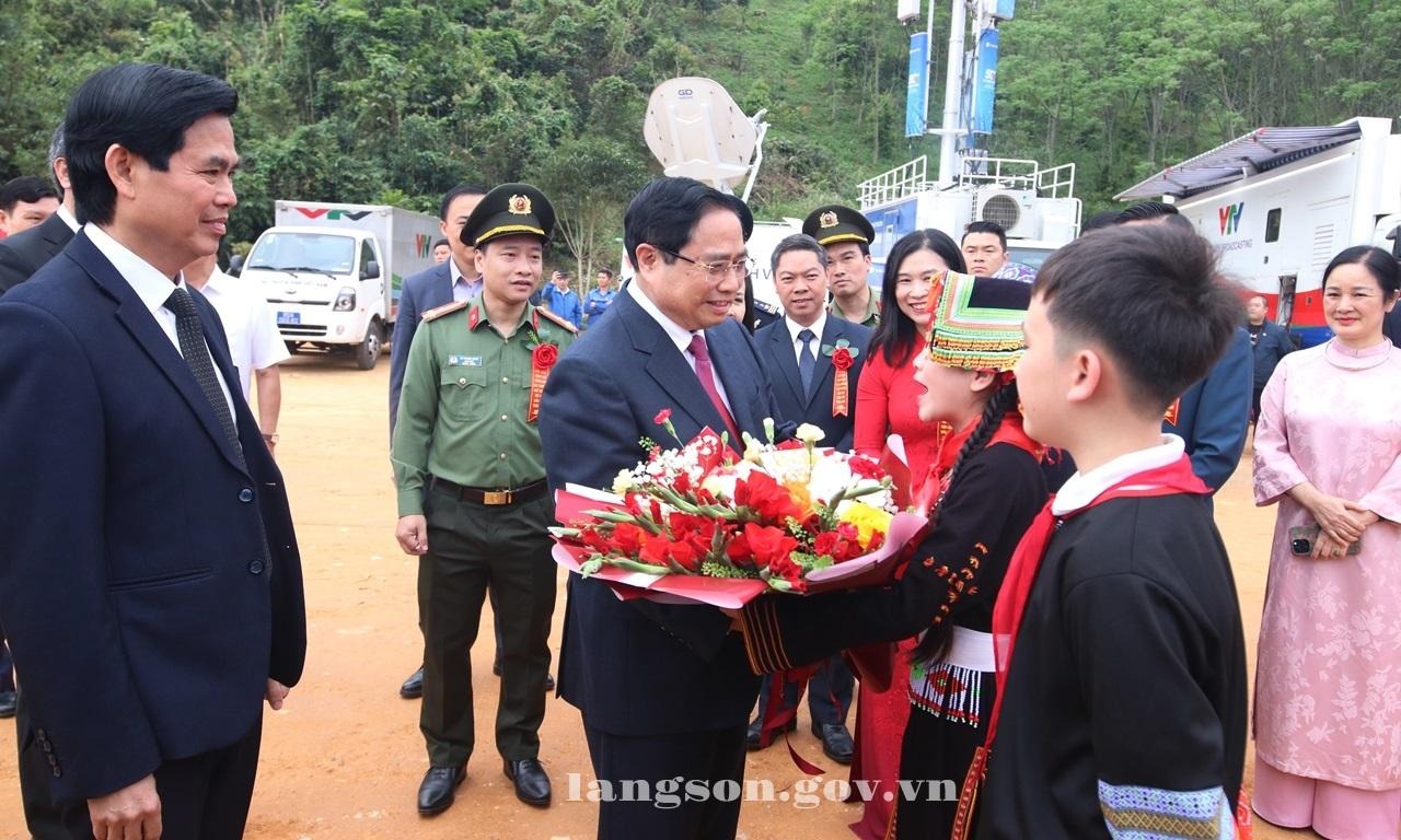 Các em học sinh tại điểm cầu Trường phổ thông nội trú liên cấp Tiểu học và Trung học cơ sở Đồng Đăng tặng hoa chào mừng Thủ tướng Chính phủ Phạm Minh Chính