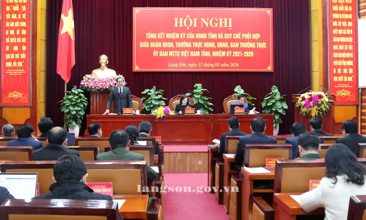 Ngày 13/01/2026, Hội đồng nhân dân tỉnh tổ chức Hội nghị tổng kết nhiệm kỳ của HĐND tỉnh và Quy chế phối hợp giữa Đoàn Đại biểu Quốc hội, Thường trực HĐND, UBND, Ban Thường trực Uỷ ban MTTQ Việt Nam tỉnh nhiệm kỳ 2021-2026. Tham dự Hội nghị có đồng chí Hoàng Quốc Khánh, Bí thư Tỉnh uỷ; đồng chí Đoàn Thị Hậu, Phó Bí thư Thường trực Tỉnh uỷ, Chủ tịch HĐND tỉnh; đồng chí Nguyễn Cảnh Toàn, Phó Bí thư Tỉnh uỷ, Chủ tịch UBND tỉnh; đồng chí Hồ Tiến Thiệu, nguyên Phó Bí thư Tỉnh uỷ, nguyên Chủ tịch UBND tỉnh.