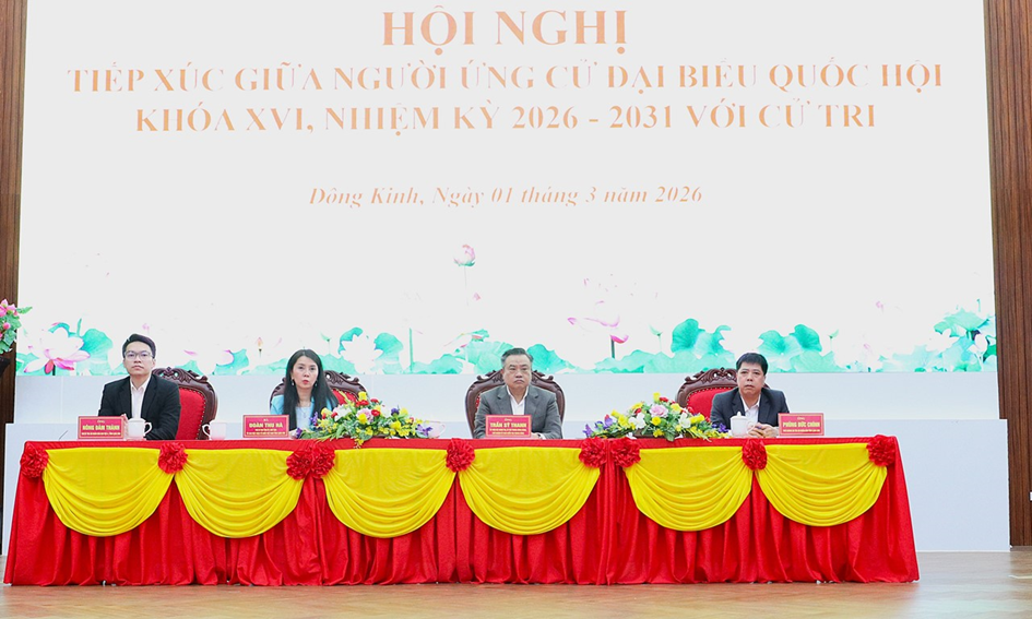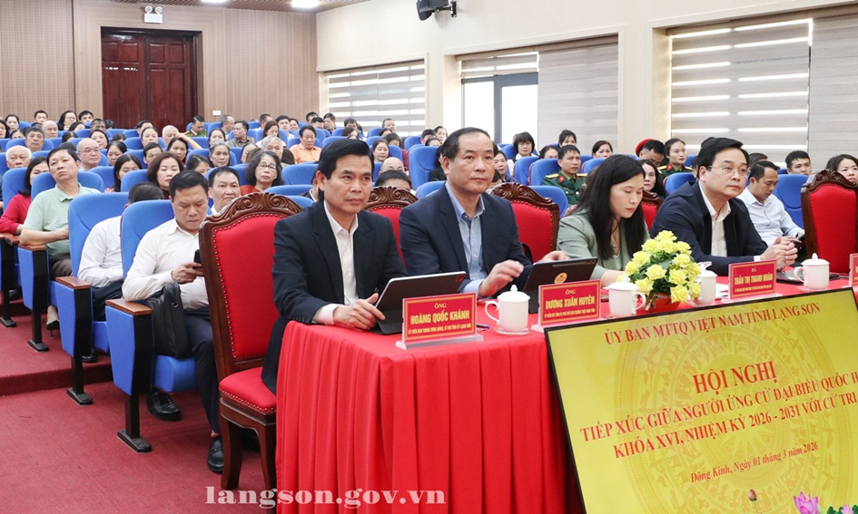 Chiều 01/3/2026, tại phường Đông Kinh, Ban Thường trực Ủy ban Mặt trận Tổ quốc Việt Nam tỉnh Lạng Sơn tổ chức Hội nghị tiếp xúc cử tri để người ứng cử đại biểu Quốc hội (ĐBQH) khóa XVI, nhiệm kỳ 2026 - 2031 vận động bầu cử thuộc đơn vị bầu cử số 1. Hội nghị được tổ chức theo hình thức trực tiếp tại điểm cầu phường Đông Kinh và kết nối trực tuyến đến điểm cầu các phường Tam Thanh, Lương Văn Tri và Kỳ Lừa.