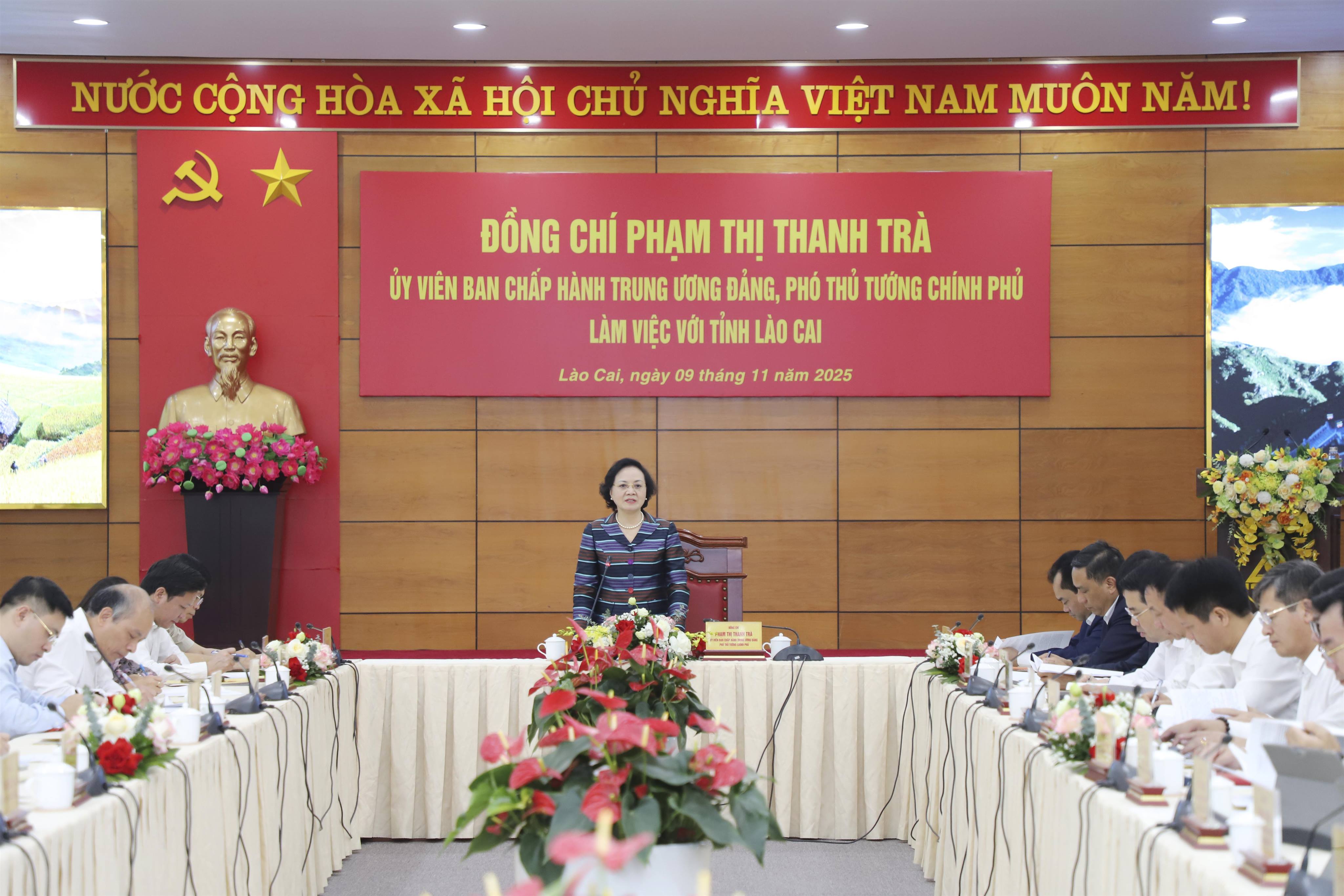 Phát biểu chỉ đạo tại buổi làm việc, Phó Thủ tướng Chính phủ Phạm Thị Thanh Trà đánh giá cao những kết quả Lào Cai đã đạt được trong phát triển kinh tế - xã hội gắn với tiến bộ công bằng xã hội; an ninh chính trị, trật tự an toàn xã hội, quan hệ đối ngoại; vận hành chính quyền địa phương hai cấp đạt được nhiều kết quả phấn khởi và ấn tượng.
