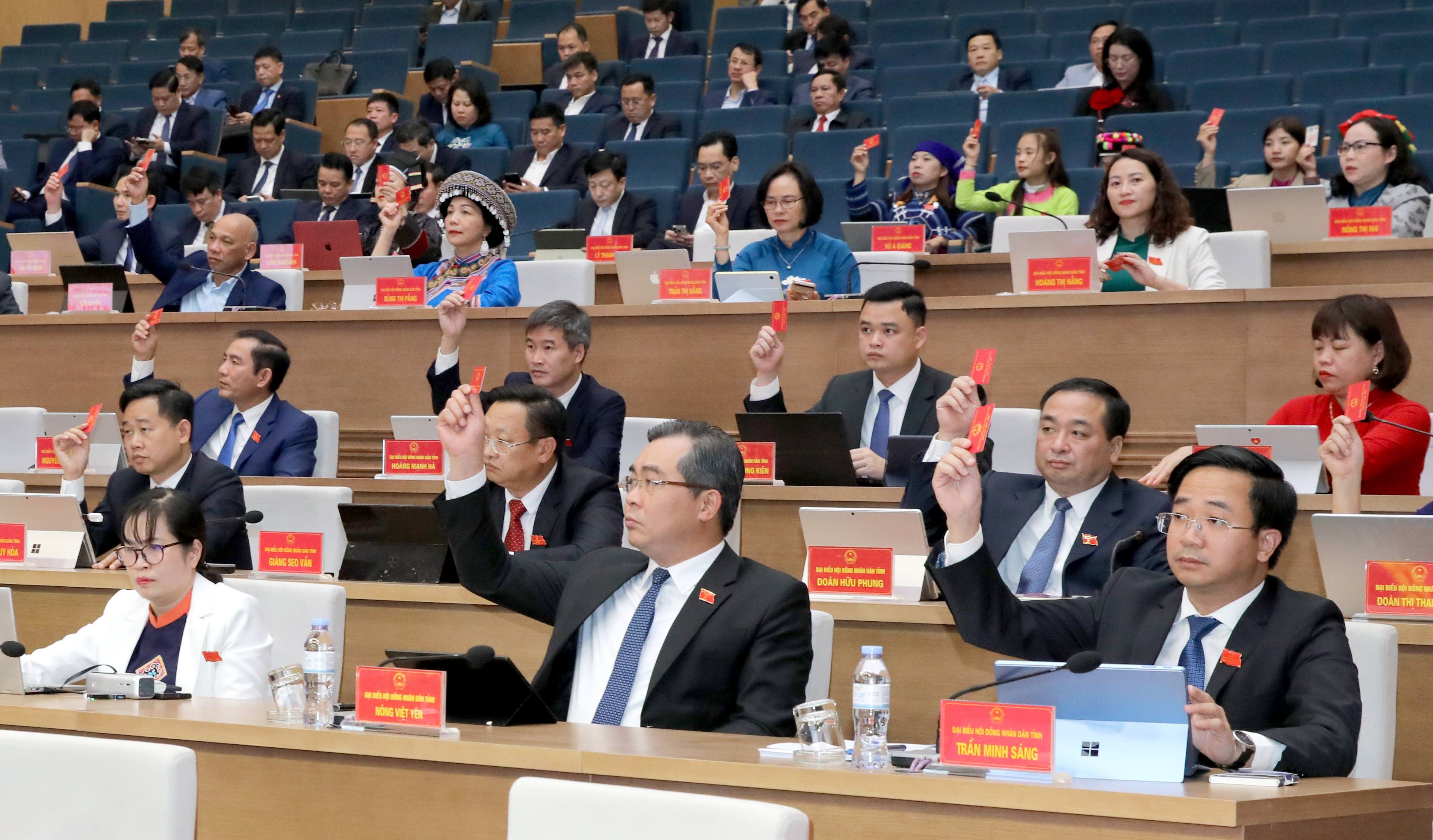 Trên cơ sở xem xét các tờ trình, dự thảo nghị quyết, các báo cáo thẩm tra và thảo luận sâu các nội dung trình tại kỳ họp, với sự thống nhất cao, Kỳ họp thứ 6 - HĐND tỉnh Lào Cai khóa XVI đã biểu quyết thông qua 46 Nghị quyết có ý nghĩa đặc biệt quan trọng gắn với yêu cầu đổi mới quản trị địa phương, hoàn thiện cơ chế, chính sách, tinh gọn tổ chức bộ máy và vận hành mô hình chính quyền địa phương hai cấp. Cụ thể: