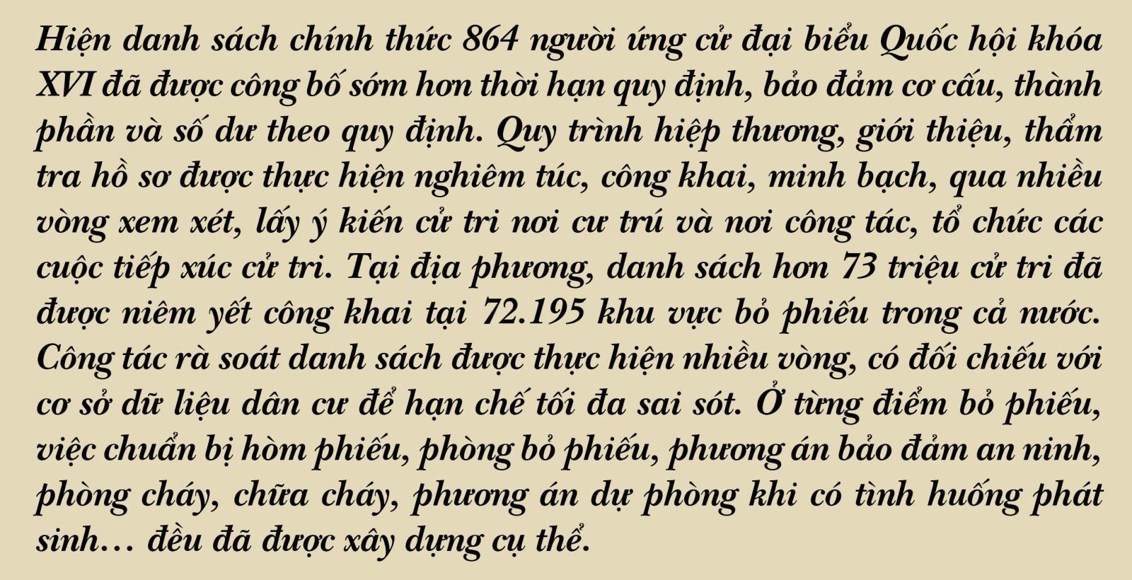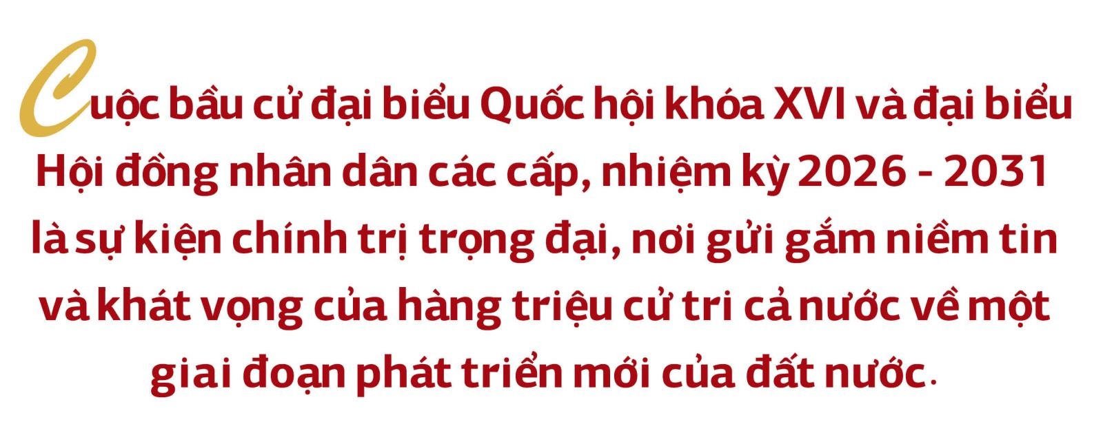 Vì vậy, cuộc bầu cử đại biểu Quốc hội khóa XVI không đơn thuần là một sự kiện chính trị định kỳ 5 năm một lần. Đây là sự kiện trọng đại để Nhân dân trực tiếp trao quyền, lựa chọn những người xứng đáng nhất đại diện cho hơn 100 triệu dân quyết định những vấn đề chiến lược của đất nước trong 5 năm tới. Thành công của cuộc bầu cử không chỉ được đo bằng tỷ lệ cử tri đi bỏ phiếu hay sự tuân thủ quy trình pháp luật, mà còn bằng chất lượng đội ngũ đại biểu được lựa chọn, những người có đủ bản lĩnh, trí tuệ và khát vọng phát triển.