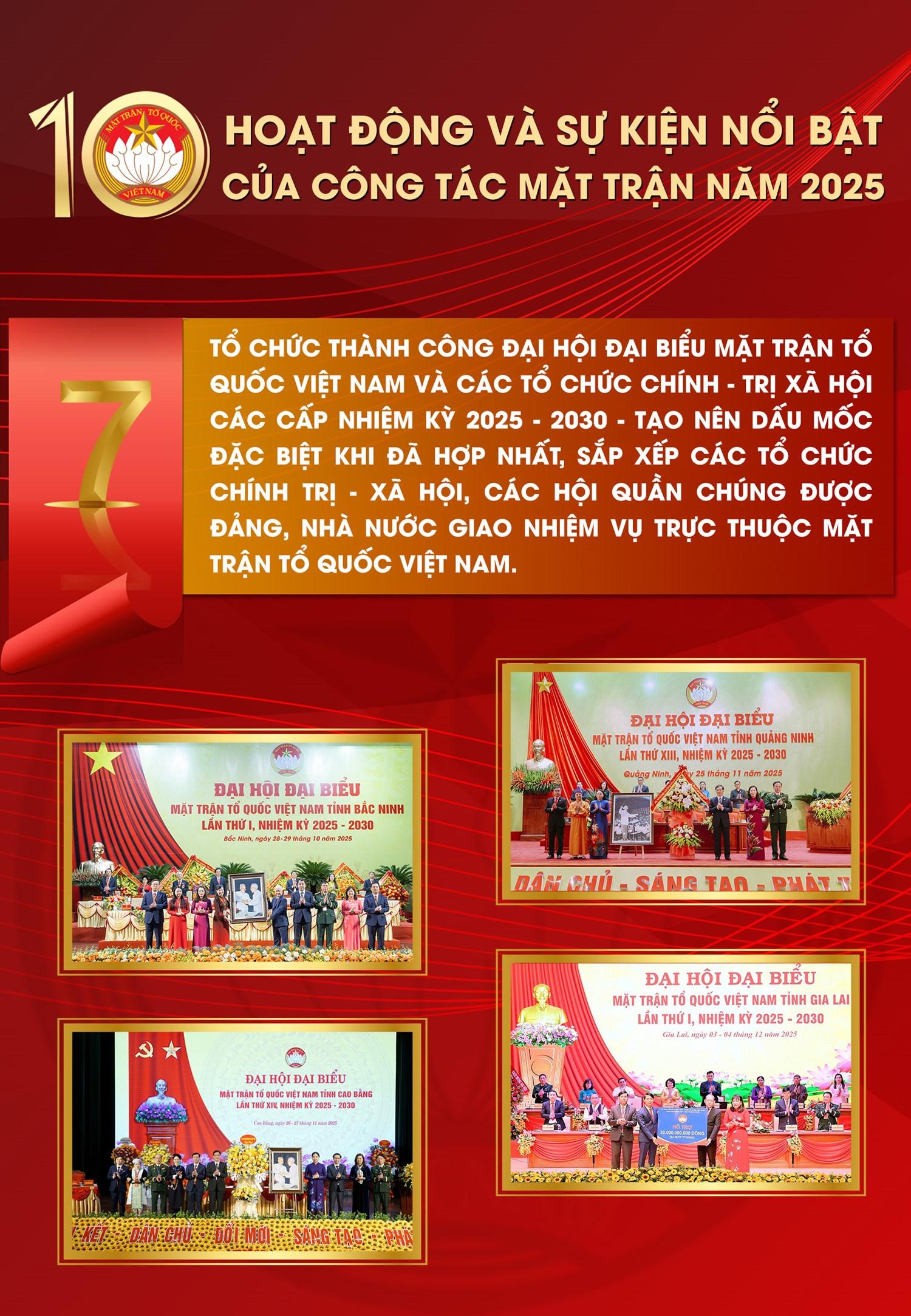 7. Tổ chức thành công Đại hội đại biểu Mặt trận Tổ quốc Việt Nam và các tổ chức chính trị - xã hội các cấp nhiệm kỳ 2025 - 2030 - Tạo nên dấu mốc đặc biệt khi đã hợp nhất, sắp xếp các tổ chức chính trị - xã hội, các hội quần chúng được Đảng, Nhà nước giao nhiệm vụ trực thuộc Mặt trận Tổ quốc Việt Nam.