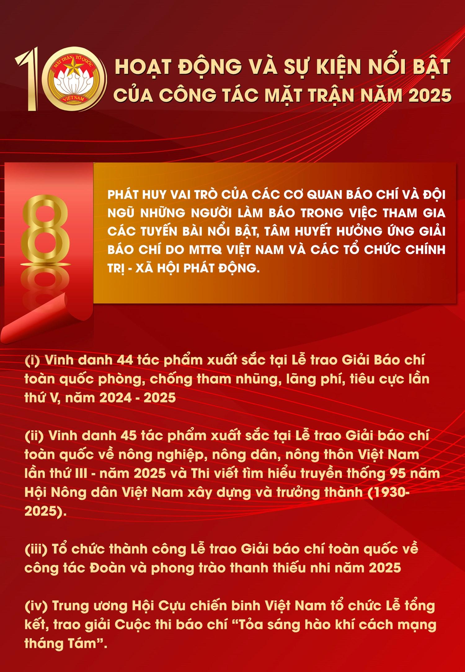 8. Phát huy vai trò của các cơ quan báo chí và đội ngũ những người làm báo trong việc tham gia các tuyến bài nổi bật, tâm huyết hưởng ứng Giải báo chí do MTTQ Việt Nam và các tổ chức chính trị - xã hội phát động.
