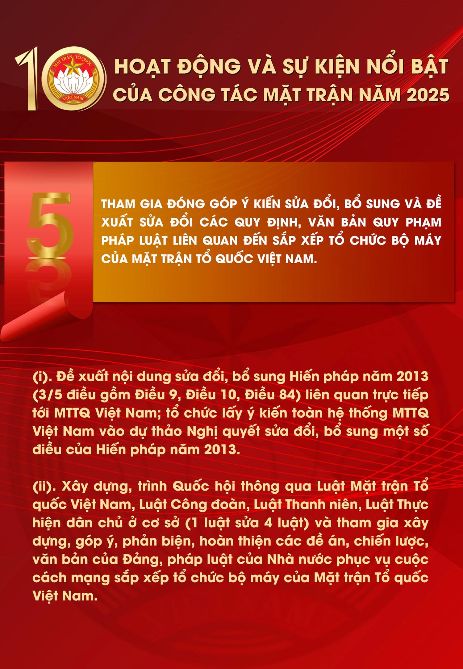 (ii). Xây dựng, trình Quốc hội thông qua Luật Mặt trận Tổ quốc Việt Nam, Luật Công đoàn, Luật Thanh niên, Luật thực hiện dân chủ ở cơ sở (1 luật sửa 4 luật) và tham gia xây dựng, góp ý, phản biện, hoàn thiện các đề án, chiến lược, văn bản của Đảng, pháp luật của Nhà nước phục vụ cuộc cách mạng sắp xếp tổ chức bộ máy của Mặt trận Tổ quốc Việt Nam.