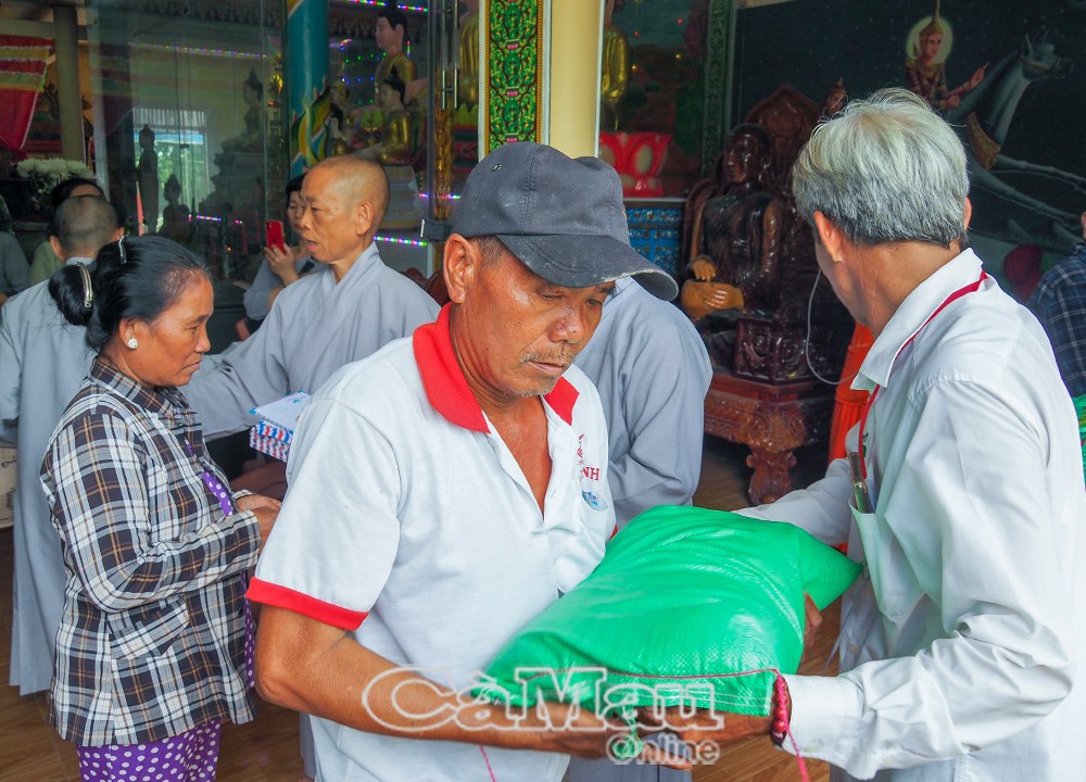 | Dịp này, chùa Rạch Giồng trao 150 suất quà (gạo và tiền mặt) hỗ trợ bà con khó khăn |