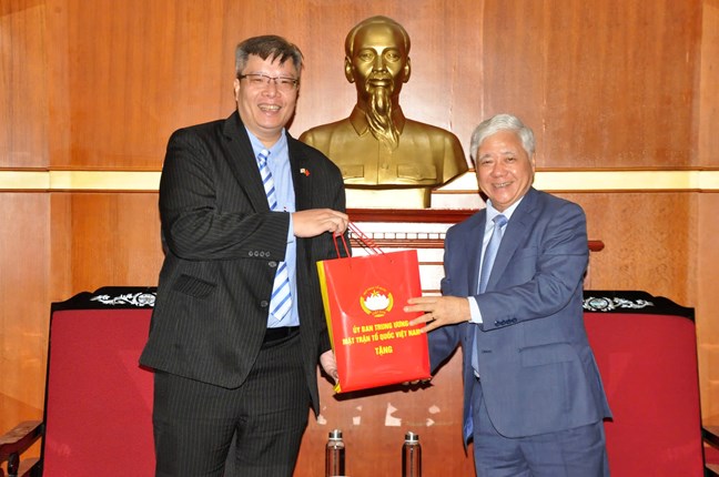 | Chủ tịch Ủy ban Trung ương MTTQ Việt Nam Đỗ Văn Chiến nhận quà lưu niệm từ TS Trần Hải Linh, Ủy viên Ủy ban Trung ương MTTQ Việt Nam, Chủ tịch Hiệp hội Doanh nhân Đầu tư Việt Nam – Hàn Quốc |