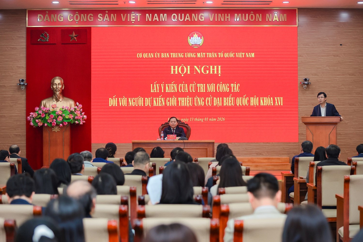 Tại Hội nghị, các cử tri đã nghe ông Nguyễn Phi Long, Ủy viên dự khuyết Trung ương Đảng, Phó Bí thư Đảng ủy MTTQ, các đoàn thể Trung ương quán triệt mục đích, yêu cầu, tiêu chuẩn đại biểu Quốc hội và giới thiệu danh sách của 5 người được giới thiệu ứng cử.