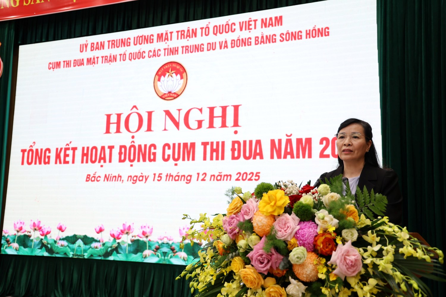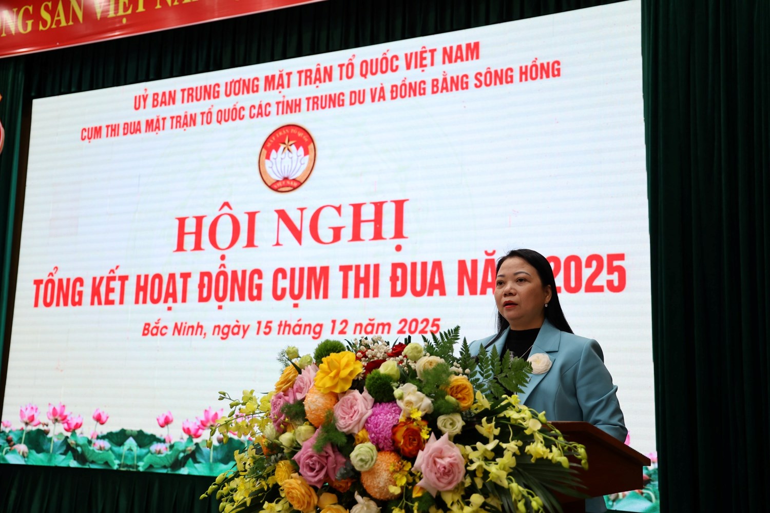 | Bà Ngụy Thị Tuyến, Phó chủ tịch Thường trực Ủy ban MTTQ tỉnh Bắc Ninh báo cáo tổng kết Cụm thi đua MTTQ các tỉnh trung du và Đồng bằng sông Hồng năm 2025 |