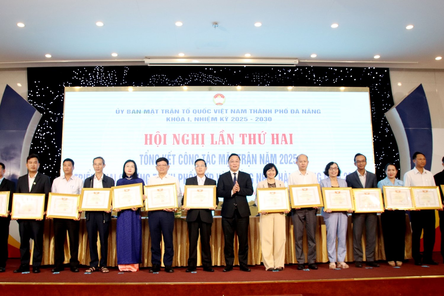 | Chủ tịch Ủy ban Mặt trận Tổ quốc Việt Nam thành phố Đà Nẵng Lê Trí Thanh (giữa) trao Bằng khen cho các tập thể xuất sắc trong công tác năm 2025. Ảnh: TRỌNG HUY |