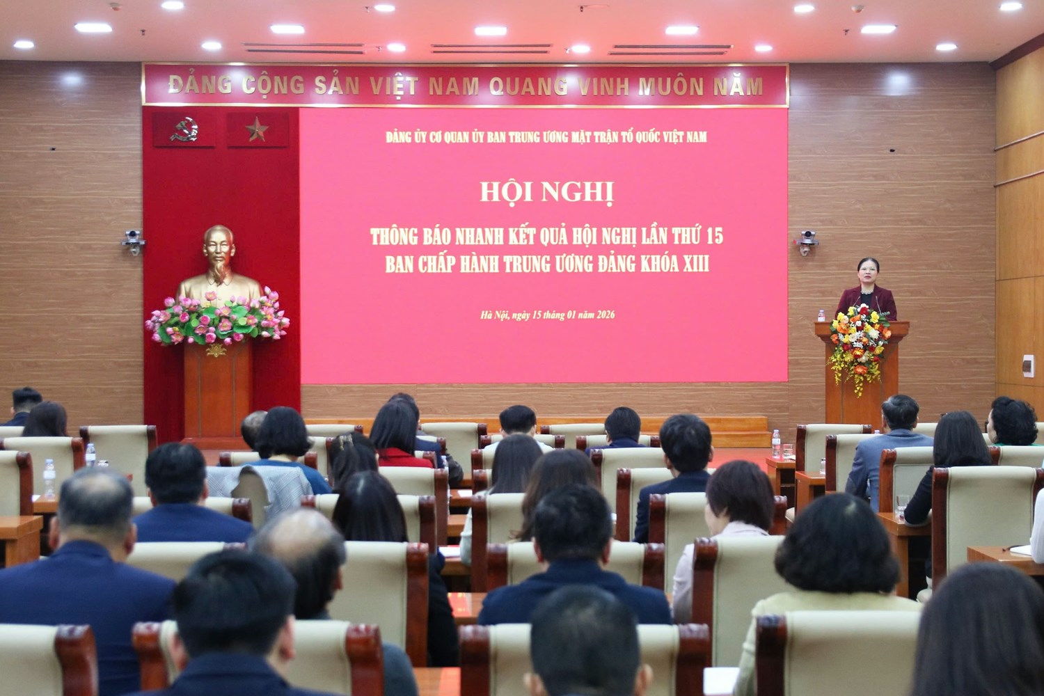 (Mặt trận) - Chiều 15/1, tại Hà Nội, Đảng bộ Cơ quan UBTƯ MTTQ Việt Nam tổ chức Hội nghị thông báo nhanh kết quả Hội nghị lần thứ 15 Ban Chấp hành Trung ương Đảng khóa XIII và Hội nghị tổng kết công tác xây dựng Đảng năm 2025, triển khai nhiệm vụ công tác năm 2026.