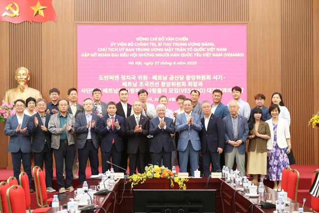 (Mặt trận) - Chiều 27/6, tại Hà Nội, ông Đỗ Văn Chiến, Ủy viên Bộ Chính trị, Bí thư Trung ương Đảng, Chủ tịch UBTƯ MTTQ Việt Nam đã gặp gỡ đoàn đại biểu Hội những người Hàn Quốc yêu Việt Nam (VESAMO) do ông Chang Ho Ick, Phó Chủ tịch Tập đoàn Dongwon, Phó Chủ tịch Phòng Thương mại và Công nghiệp thành phố Busan, Chủ tịch VESAMO dẫn đầu, sang thăm và làm việc tại Việt Nam.