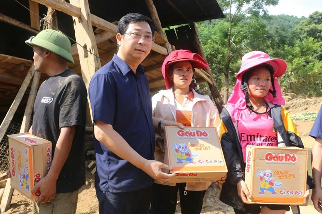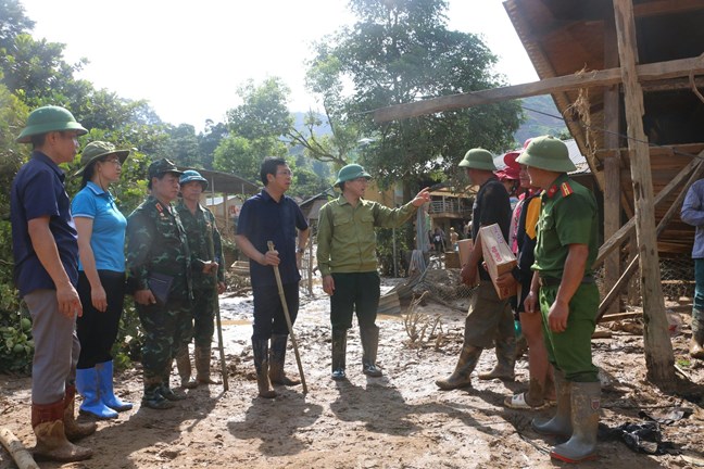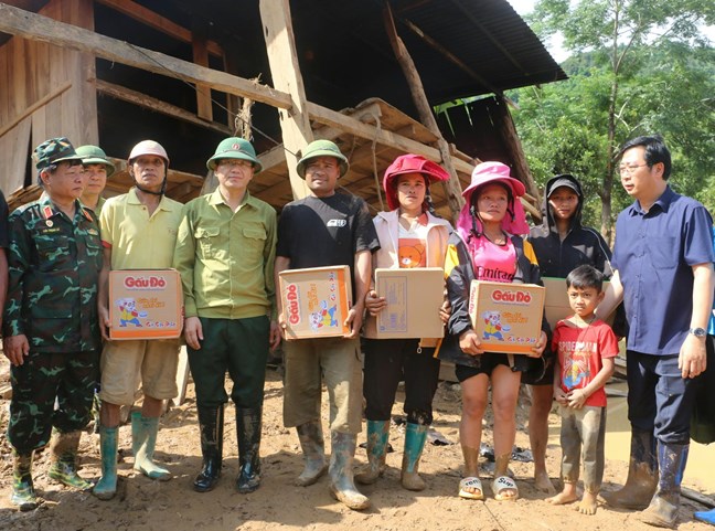 Trực tiếp đến các điểm sạt lở, đoàn công tác đã ân cần thăm hỏi, động viên các hộ gia đình bị thiệt hại về nhà ở, có người thân bị mất và nhân dân vùng lũ; đồng thời mong bà con vượt qua khó khăn, mất mát, sớm ổn định cuộc sống.