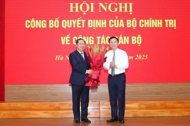| Đồng chí Đỗ Trọng Hưng, Ủy viên Trung ương Đảng, Phó Trưởng ban Tổ chức Trung ương tặng hoa chúc mừng đồng chí Nguyễn Phi Long |