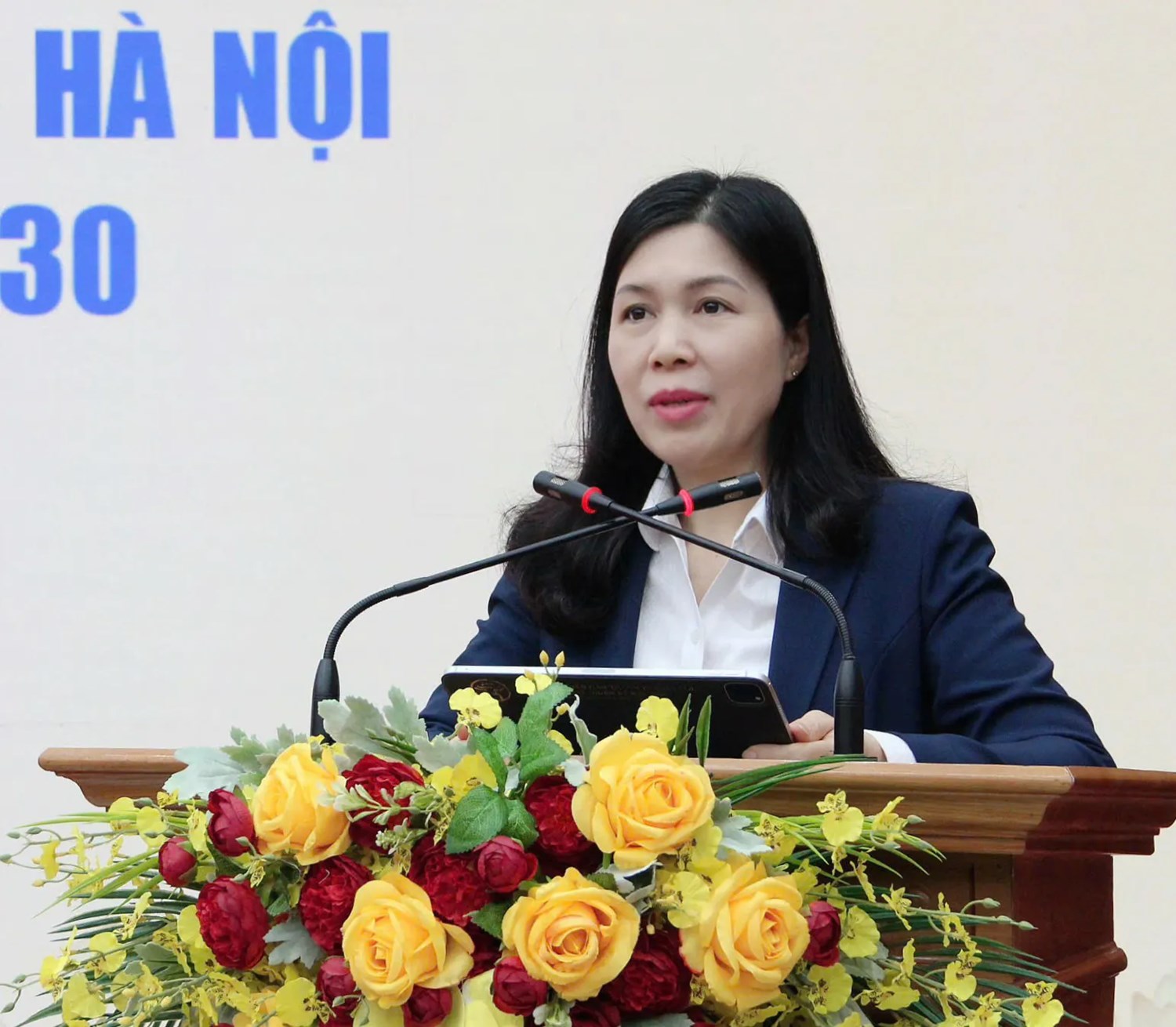 | Tân Phó Chủ tịch Thường trực Ủy ban Mặt trận Tổ quốc Việt Nam TP Hà Nội Trần Thị Phương Hoa phát biểu |