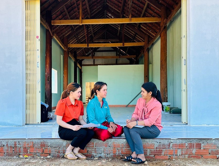 | Cán bộ UBND xã Vĩnh Sơn gặp gỡ chị Đinh Thị Hạnh (giữa) ở khu tái định canh, định cư làng K2 (Suối Đá) để nắm bắt tình hình đời sống sau khi chuyển về nơi ở mới. |