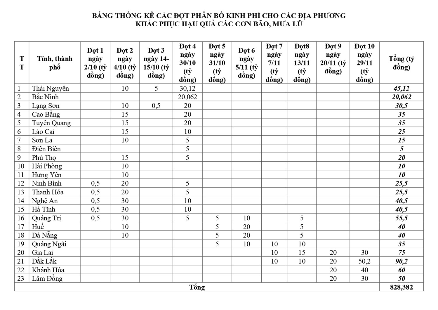 Từ số tiền tiếp nhận được, Ban Vận động Cứu trợ Trung ương đã phân bổ 10 đợt với kinh phí là 833,152 tỷ đồng qua các tài khoản của Ban cứu trợ hoặc Ủy ban Mặt trận Tổ quốc của 23 tỉnh, thành phố, trong đó, phân bổ kinh phí là 828,382 tỷ đồng; phân bổ các sản phẩm hỗ trợ là 4,77 tỷ đồng.