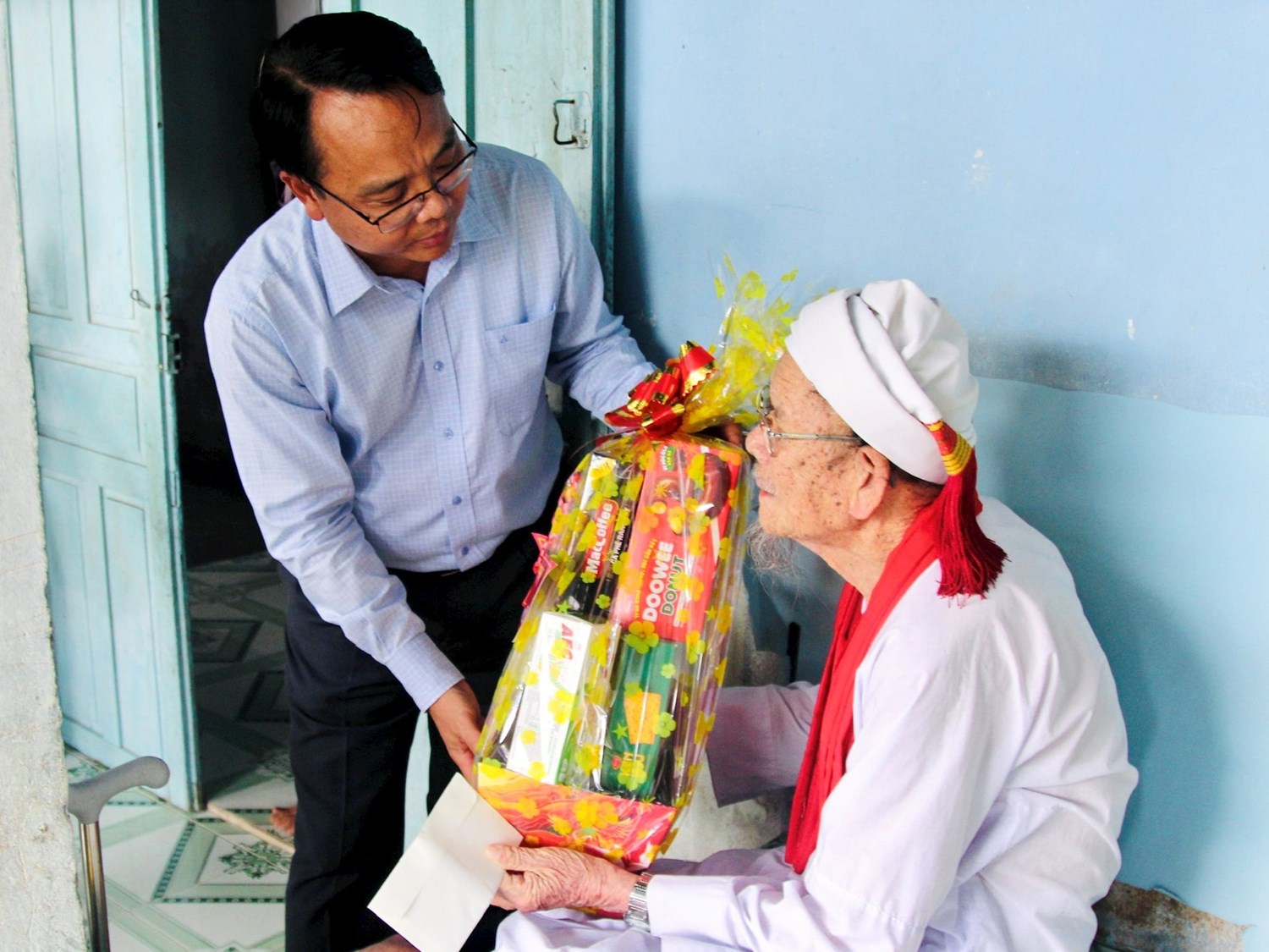 | Phó Bí thư Tỉnh ủy Lâm Đồng Đặng Hồng Sỹ tặng quà ông Thường Xuân Hữu (thôn Lạc Trị) |