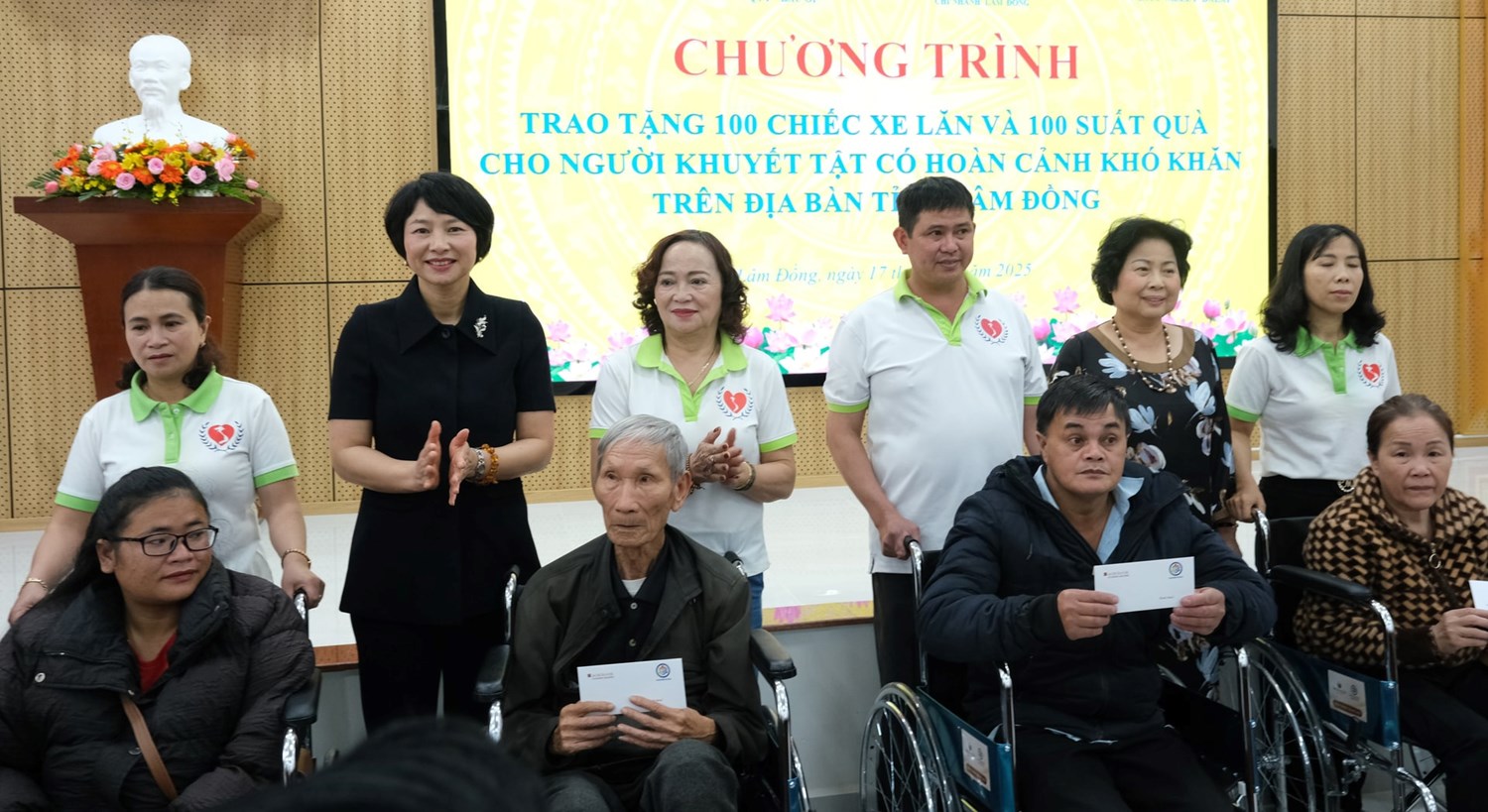 | Đồng chí Phạm Thị Phúc và bà Trương Tuyết Nhung trao quà và xe lăn cho người khuyết tật có hoàn cảnh khó khăn |
