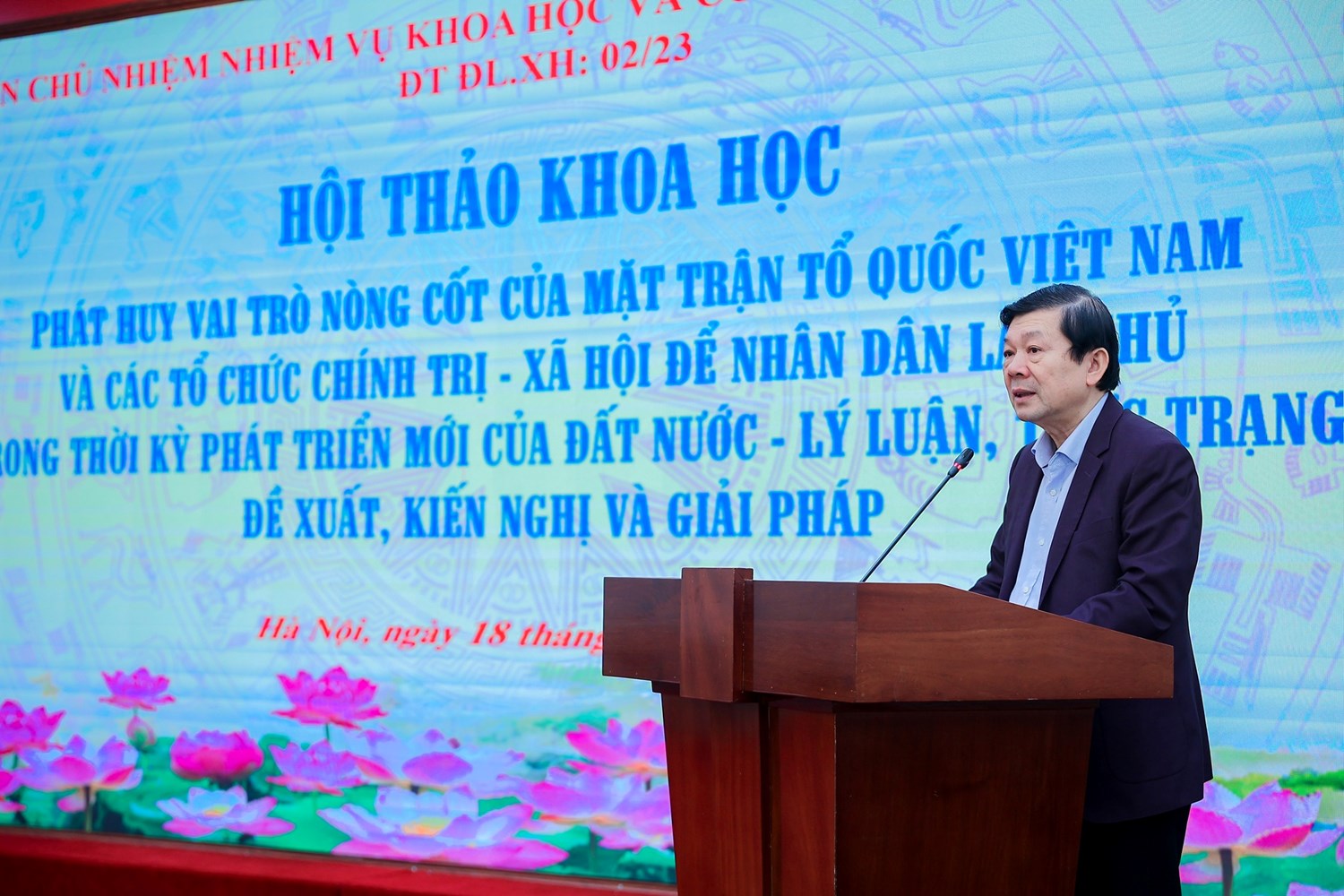 Tại Hội thảo, các chuyên gia, nhà khoa học đã tập trung thảo luận, góp ý làm rõ những vấn đề lý luận về vai trò nòng cốt của Mặt trận Tổ quốc Việt Nam và các tổ chức chính trị - xã hội để nhân dân làm chủ trong thời kỳ phát triển mới của đất nước. Đánh giá thực trạng và xác định nguyên nhân của thực trạng phát huy vai trò nòng cốt của Mặt trận Tổ quốc Việt Nam và các tổ chức chính trị - xã hội để nhân dân làm chủ qua gần 40 năm đổi mới; nhận diện rõ các vấn đề thực tiễn đặt ra cần được giải quyết nhằm phát huy vai trò nòng cốt của Mặt trận Tổ quốc Việt Nam và các tổ chức chính trị - xã hội để nhân dân làm chủ trong thời kỳ phát triển mới của đất nước. Đề xuất quan điểm, phương hướng, nhiệm vụ và giải pháp phát huy vai trò nòng cốt của Mặt trận Tổ quốc Việt Nam và các tổ chức chính trị - xã hội để nhân dân làm chủ đến năm 2030 và tầm nhìn đến năm 2045.