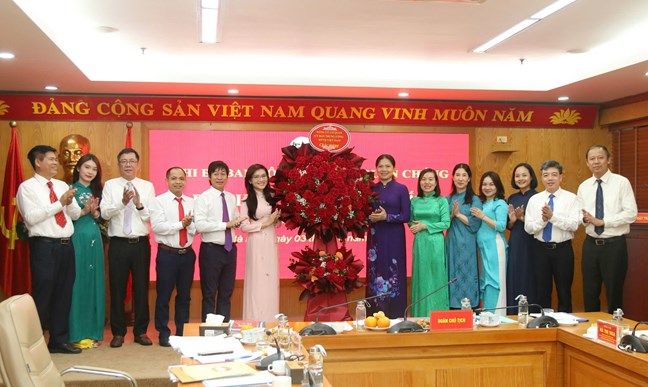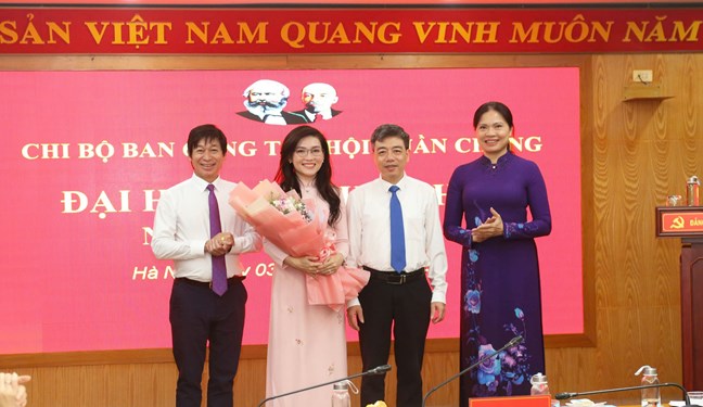 | Phó Chủ tịch Ủy ban Trung ương MTTQ Việt Nam Hà Thị Nga tặng hoa chúc mừng Chi ủy Chi bộ Ban Công tác hội quần chúng nhiệm kỳ 2025-2030 |