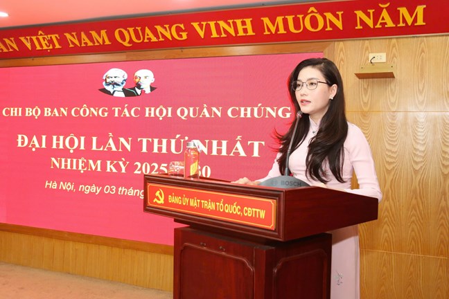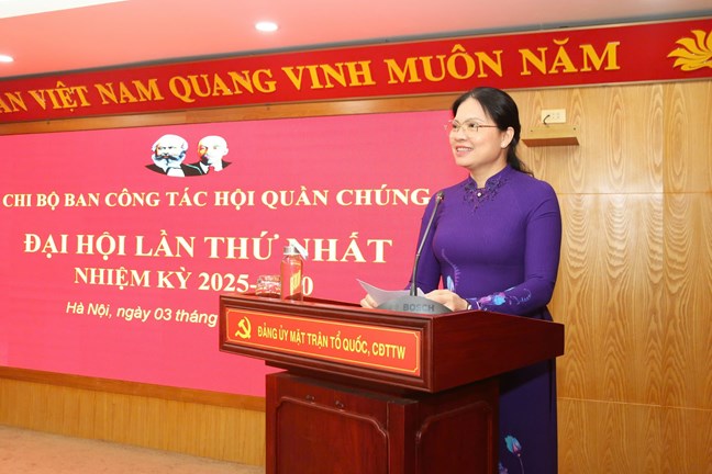 Chúc mừng các đồng chí được chỉ định tham gia cấp ủy Chi bộ Ban Công tác hội quần chúng nhiệm kỳ 2025-2030, Phó Chủ tịch Hà Thị Nga tin tưởng và kỳ vọng với một khí thế mới, quyết tâm mới, với tinh thần đoàn kết, nỗ lực vượt khó, với phương châm Đại hội đã xác định "Đoàn kế - Dân chủ - Kỷ cương - Đổi mới - Phát triển", chắc chắn Chi ủy Chi bộ sẽ lãnh đạo Chi bộ, đảng viên hoàn thành xuất sắc nhiệm vụ đã được xác định tại phương hướng, nhiệm vụ, góp phần quan trọng cùng với các đảng bộ, chi bộ trong Đảng bộ Cơ quan hiện thực hóa các quan điểm, mục tiêu, nhiệm vụ, giải pháp mà Đại hội Đảng bộ Cơ quan UBTƯ MTTQ Việt Nam sẽ đề ra trong nhiệm kỳ 2025-2030.