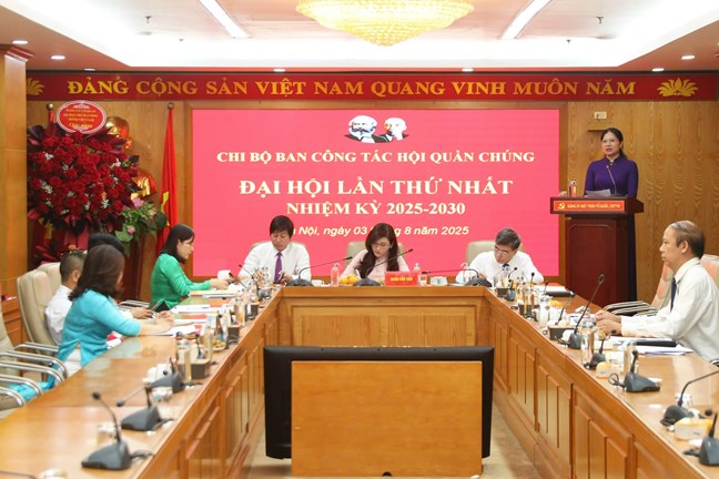 (Mặt trận) - Chiều 3/8, tại Hà Nội, Chi bộ Ban Công tác hội quần chúng tổ chức Đại hội lần thứ I, nhiệm kỳ 2025-2030. Đồng chí Hà Thị Nga, Ủy viên Trung ương Đảng, Ủy viên Ban Thường vụ Đảng ủy MTTQ, các đoàn thể Trung ương, Phó Bí thư Thường trực Đảng ủy Cơ quan UBTƯ MTTQ Việt Nam, Phó Chủ tịch UBTƯ MTTQ Việt Nam dự và phát biểu tại Đại hội.