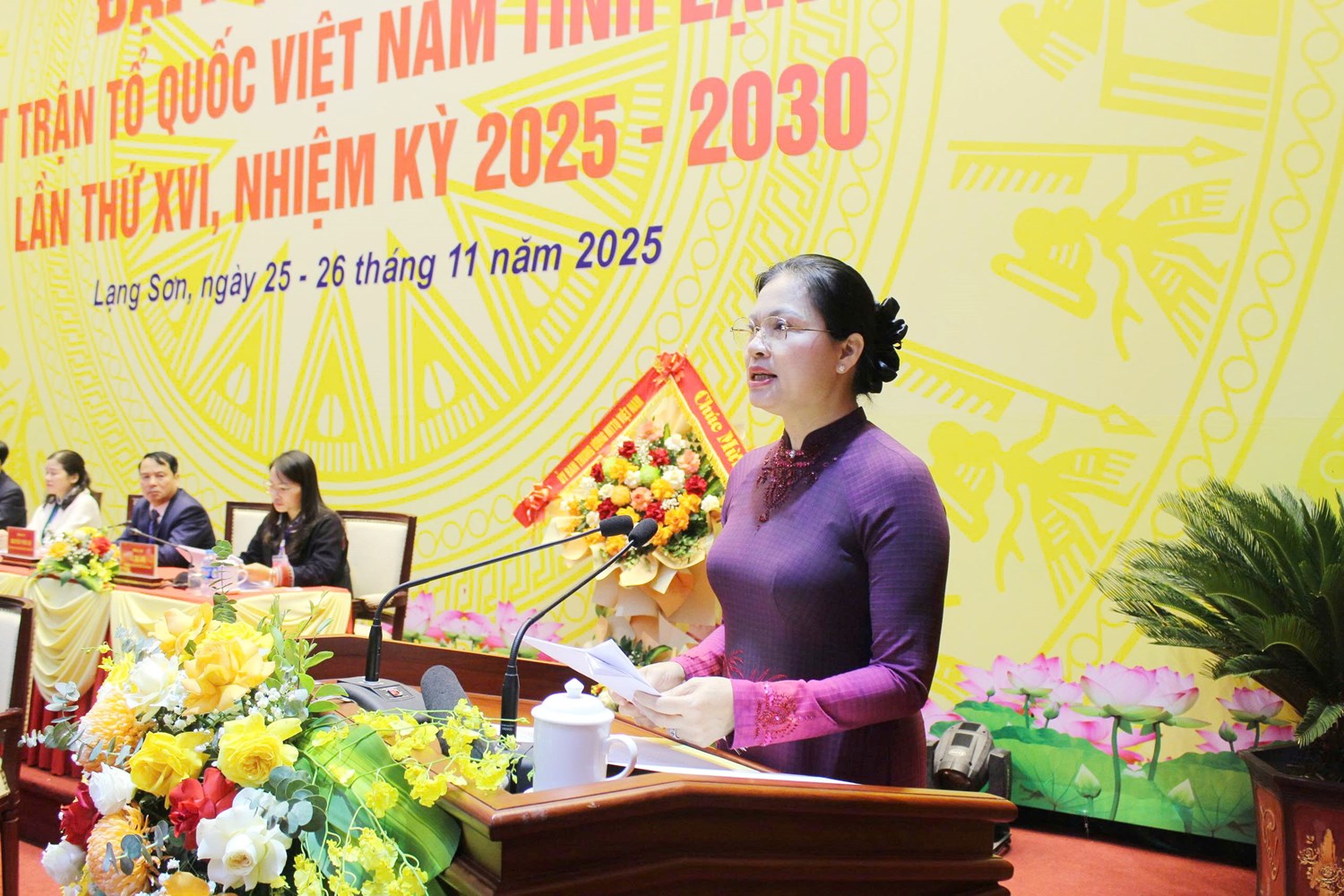 Tới dự và phát biểu chỉ đạo tại Đại hội, bà Hà Thị Nga, Ủy viên Trung ương Đảng, Phó Chủ tịch Ủy ban Trung ương MTTQ Việt Nam bày tỏ niềm vui mừng và xúc động được về dự Đại hội đại biểu MTTQ Việt Nam tỉnh Lạng Sơn lần thứ XVI, nhiệm kỳ 2025-2030 - sự kiện chính trị quan trọng đánh dấu bước phát triển mới của khối Đại đoàn kết toàn dân tộc trên địa bàn tỉnh Lạng Sơn; đồng thời nhấn mạnh, về với Lạng Sơn hôm nay là về miền đất biên cương giàu truyền thống cách mạng, giàu bản sắc văn hóa của người xứ Lạng – hiền hòa, nhân ái, đoàn kết, kiên cường nơi phên giậu Tổ quốc.