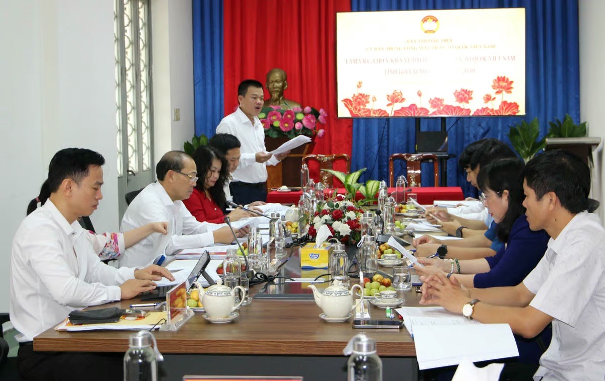 | Các lãnh đạo Ủy ban Trung ương Mặt trận Tổ quốc Việt Nam và lãnh đạo Mặt trận Khánh Hoà, Gia Lai tại buổi làm việc. Ảnh: Q.Đ |