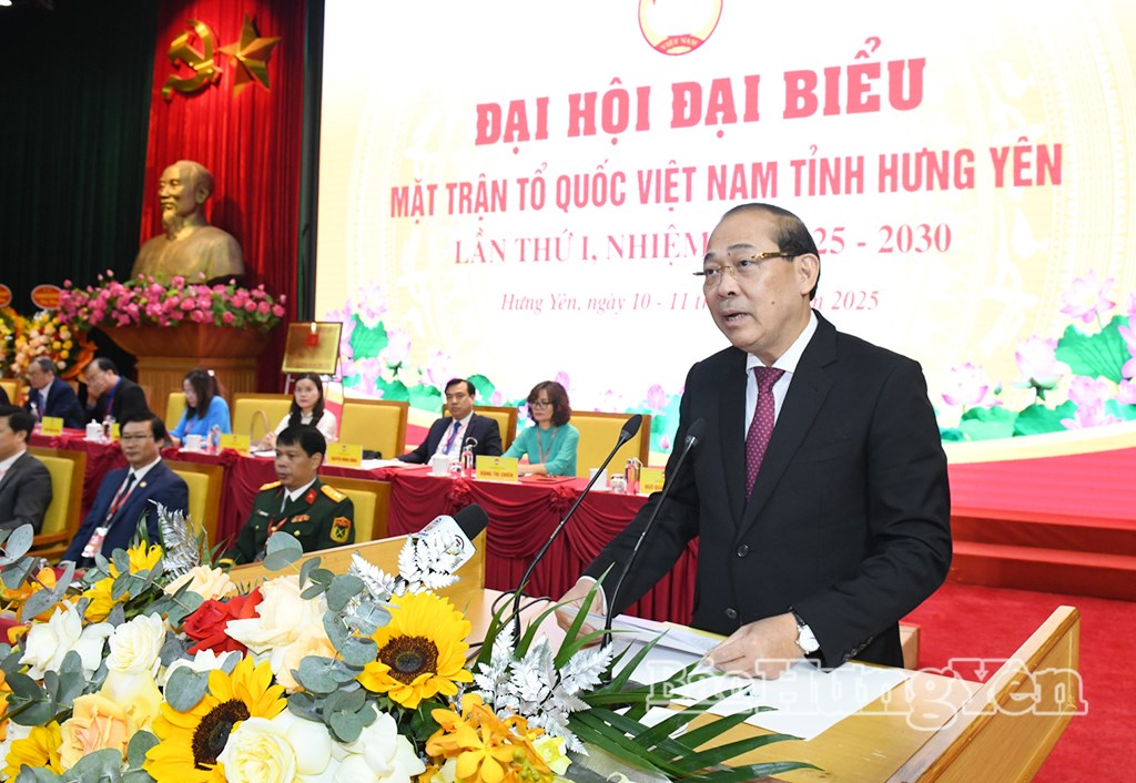 Phát biểu chỉ đạo Đại hội, ông Hoàng Công Thủy, Phó Chủ tịch Ủy ban Trung ương MTTQ Việt Nam biểu dương, ghi nhận những kết quả mà MTTQ Việt Nam các cấp trong tỉnh đã đạt được trong nhiệm kỳ qua. Đồng thời nhấn mạnh nhiệm vụ, mục tiêu của nhiệm kỳ 2025 - 2030, MTTQ Việt Nam tỉnh Hưng Yên cần quan tâm xây dựng tổ chức MTTQ Việt Nam các cấp thật sự vững mạnh, chuyên nghiệp, gần dân và gắn bó mật thiết với Nhân dân; đổi mới mạnh mẽ nội dung, phương thức hoạt động theo hướng linh hoạt, thực chất, hiệu quả; thực hiện cơ chế phối hợp “một việc- một đầu mối- một thời hạn- một kết quả” rõ ràng, minh bạch; tập trung triển khai các hoạt động, hướng mạnh về cơ sở; tập trung thực hiện tốt chức năng đại diện, bảo vệ quyền và lợi ích hợp pháp, chính đáng của Nhân dân, thực sự khơi dậy được tinh thần yêu nước, khát vọng vươn lên, thúc đẩy đoàn kết dân tộc, đồng thuận xã hội, huy động sức dân, lòng dân, nguồn lực của dân cho sự phát triển của tỉnh.