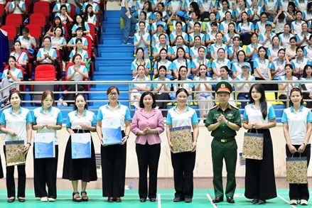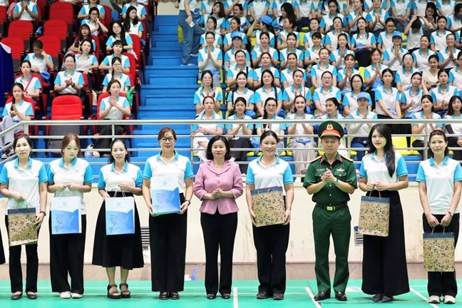 | Ủy viên TƯ Đảng, Phó Chủ tịch UBTƯ MTTQ Việt Nam, Chủ tịch Hội LHPN Việt Nam Nguyễn Thị Tuyến (giữa) tặng quà động viên các hội viên, phụ nữ tham gia tập luyện diễu hành |