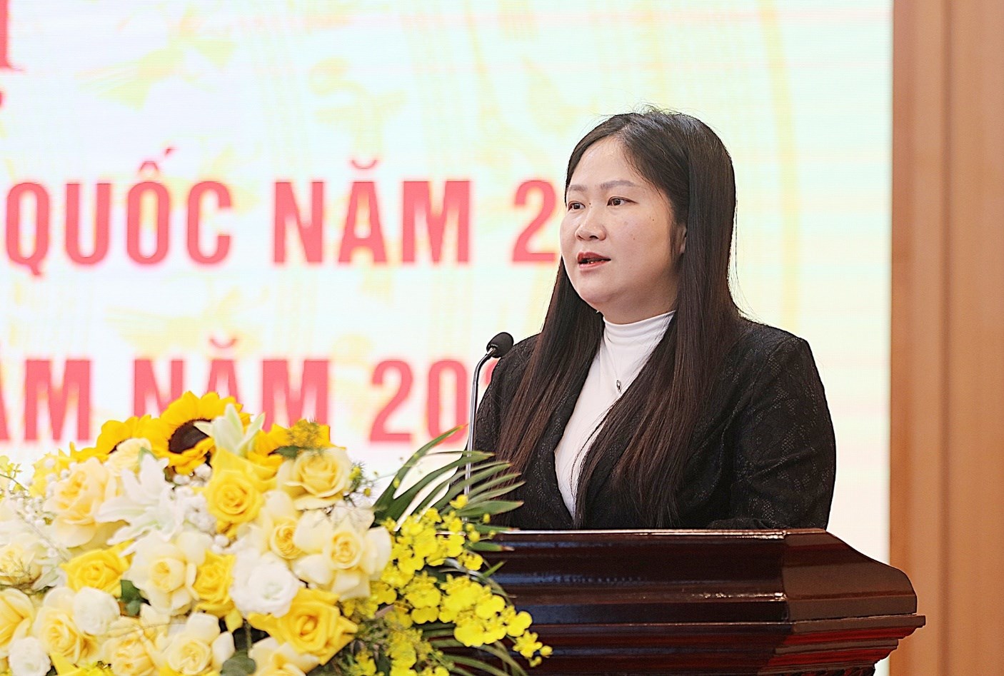| Phó Bí thư Tỉnh ủy, Chủ tịch Ủy ban MTTQ Việt Nam tỉnh Bùi Thị Minh phát biểu tại hội nghị |