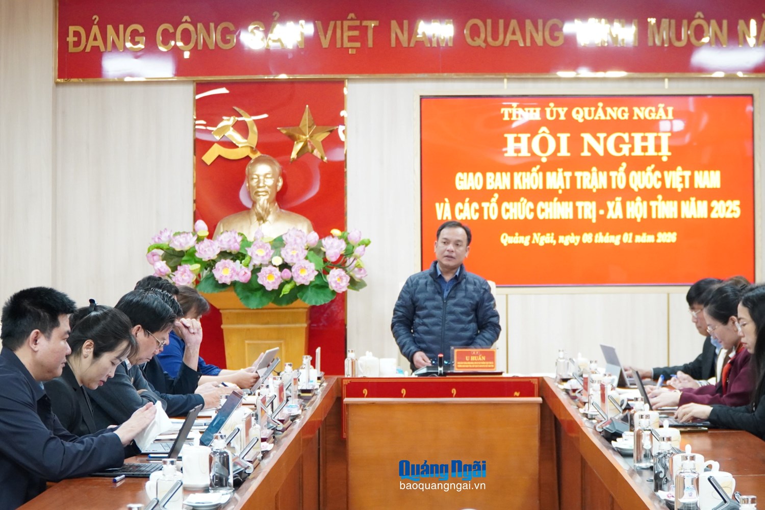 (Mặt trận) - Ủy viên dự khuyết Trung ương Đảng, Phó Bí thư Thường trực Tỉnh ủy, Trưởng đoàn Đại biểu Quốc hội tỉnh Quảng Ngãi, Chủ tịch Ủy ban Mặt trận Tổ quốc Việt Nam tỉnh Quảng Ngãi U Huấn chủ trì Hội nghị giao ban Khối Mặt trận Tổ quốc Việt Nam và các tổ chức chính trị - xã hội tỉnh Quảng Ngãi năm 2025.