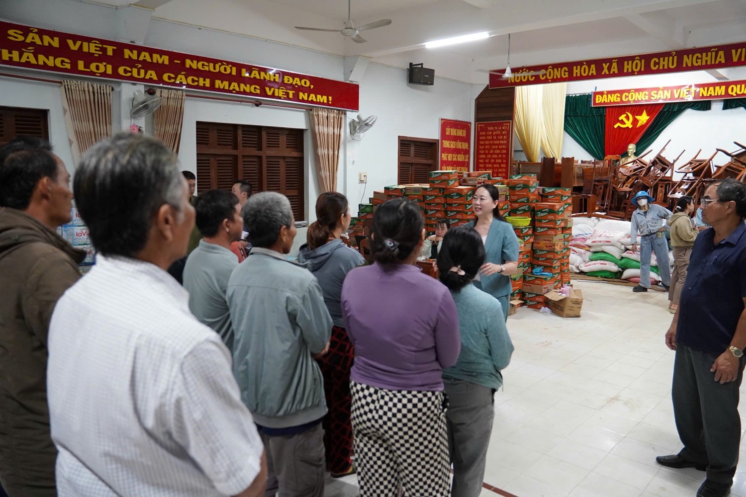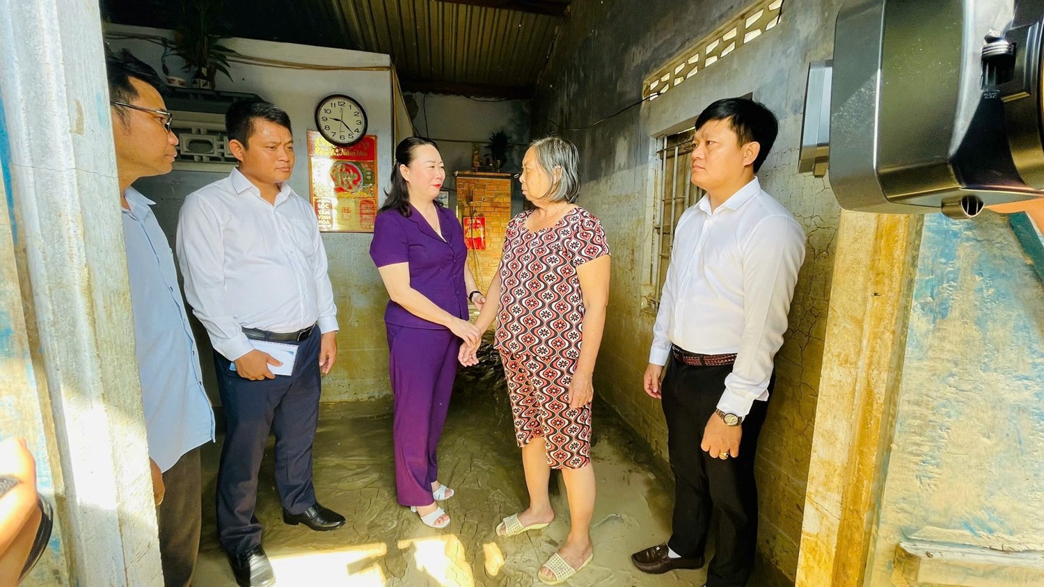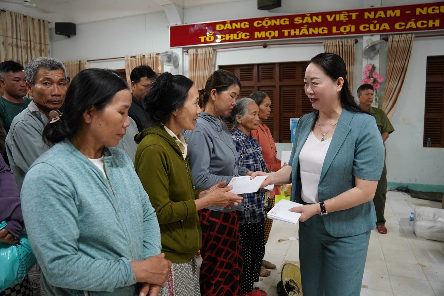 Bà Nguyễn Thị Ái Vân trao nhiều phần quà hỗ trợ và động viên tinh thần các hộ gia đình bị ảnh hưởng do bão lũ