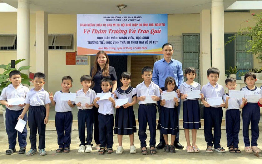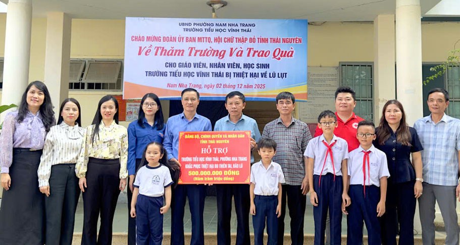 Đoàn công tác cũng đã thăm hỏi, động viên giáo viên, học sinh trường Tiểu học Vĩnh Thái trao tặng 50 suất quà cho học sinh và giáo viên bị ảnh hưởng do thiên tai và trao biển tượng trưng hỗ trợ 500 triệu đồng (kinh phí được trích từ nguồn quỹ cứu trợ tỉnh hỗ trợ 3 tỷ đồng cho tỉnh Khánh Hoà).