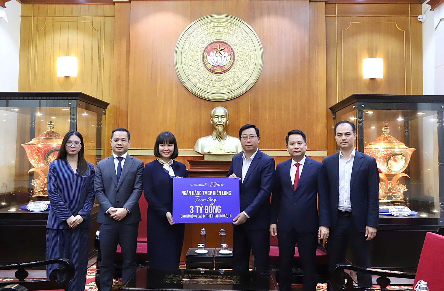 | Ông Cao Xuân Thạo, Ủy viên Đoàn Chủ tịch, Trưởng Ban Công tác xã hội Cơ quan Ủy ban Trung ương MTTQ Việt Nam tiếp nhận ủng hộ từ Ngân hàng TMCP Kiên Long |
