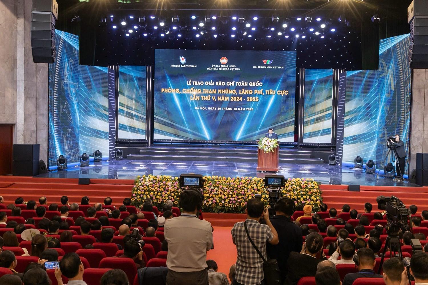 Phát biểu tại buổi Lễ, Thủ tướng Phạm Minh Chính nhấn mạnh, Lễ trao Giải Báo chí toàn quốc về phòng, chống tham nhũng, lãng phí, tiêu cực lần thứ V diễn ra trong không khí cả nước phấn khởi thi đua lập thành tích chào mừng Đại hội đại biểu toàn quốc lần thứ XIV của Đảng và kỷ niệm 95 năm Ngày truyền thống Mặt trận Tổ quốc Việt Nam (18/11/1930 - 18/11/2025). Đây là một sự kiện có ý nghĩa quan trọng ghi nhận và tôn vinh những tác phẩm báo chí xuất sắc trong công cuộc đấu tranh phòng chống tham nhũng, lãng phí, tiêu cực, góp phần xây dựng Đảng và hệ thống chính trị ngày càng trong sạch, vững mạnh.