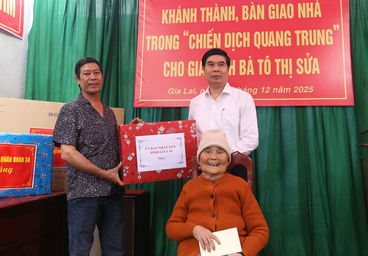 Dịp này, Phó Chủ tịch UBND tỉnh Lâm Hải Giang và lãnh đạo Quân đoàn 34 đã tặng những phần quà thiết yếu cho gia đình bà Sửa.