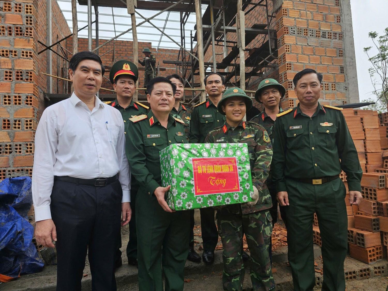 | Phó Chủ tịch UBND tỉnh Lâm Hải Giang (bìa trái) và Thiếu tướng Nguyễn Trần Long - Phó Chính ủy Quân đoàn 34 (thứ 2 từ trái sang) thăm, động viên và tặng quà cán bộ, chiến sĩ đang hỗ trợ người dân xây dựng nhà. Ảnh: H.P |